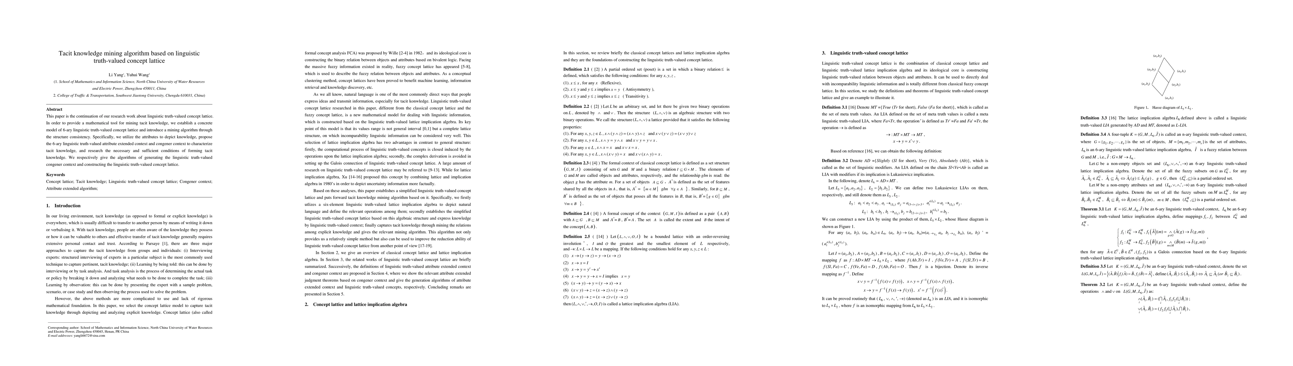This paper develops a mining algorithm for tacit knowledge using a 6-ary linguistic truth-valued concept lattice. It introduces models to depict knowledge through attributes and provides algorithms for generating congener contexts and constructing concept lattices to extract tacit knowledge.