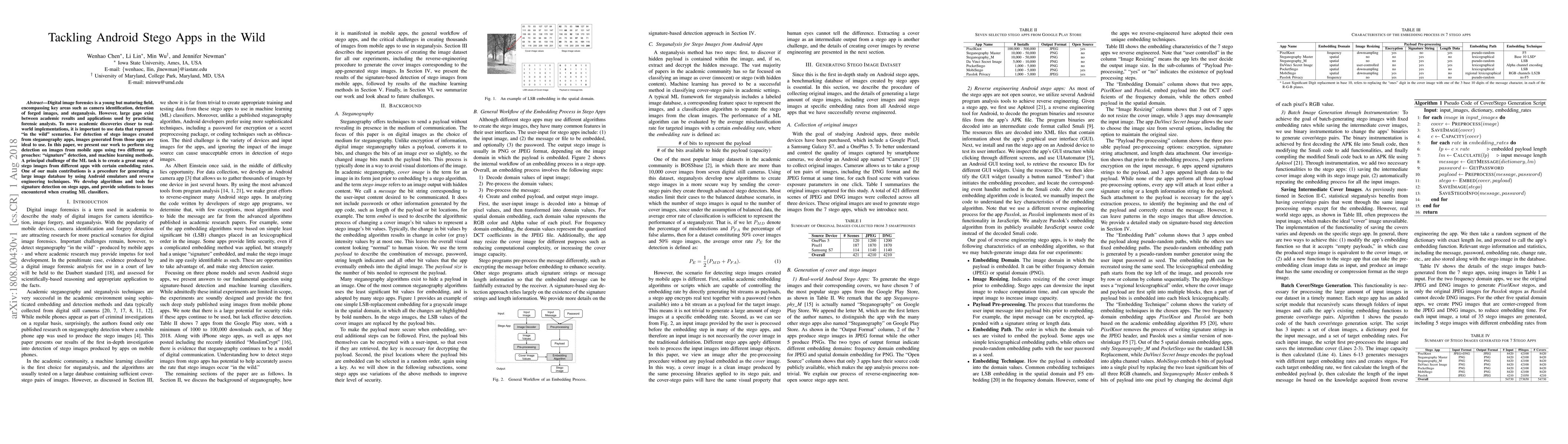 Digital image forensics is a young but maturing field, encompassing key areas such as camera identification, detection of forged images, and steganalysis. However, large gaps exist between academic results and applications used by practicing forensic analysts. To move academic discoveries closer to real-world implementations, it is important to use data that represent "in the wild" scenarios. For detection of stego images created from steganography apps, images generated from those apps are ideal to use. In this paper, we present our work to perform steg detection on images from mobile apps using two different approaches: "signature" detection, and machine learning methods. A principal challenge of the ML task is to create a great many of stego images from different apps with certain embedding rates. One of our main contributions is a procedure for generating a large image database by using Android emulators and reverse engineering techniques. We develop algorithms and tools for signature detection on stego apps, and provide solutions to issues encountered when creating ML classifiers.