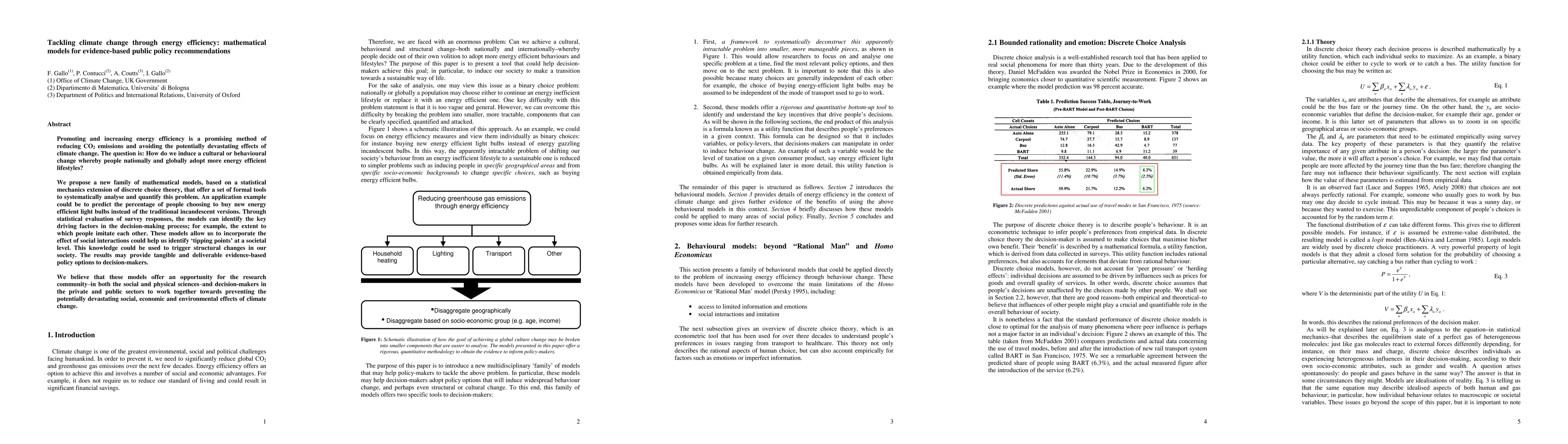 Promoting and increasing energy efficiency is a promising method of reducing CO2 emissions and avoiding the potentially devastating effects of climate change. The question is: How do we induce a cultural or behavioural change whereby people nationally and globally adopt more energy efficient lifestyles? We propose a new family of mathematical models, based on a statistical mechanics extension of discrete choice theory, that offer a set of formal tools to systematically analyse and quantify this problem. An application example could be to predict the percentage of people choosing to buy new energy efficient light bulbs instead of the traditional incandescent versions. Through statistical evaluation of survey responses, the models can identify the key driving factors in the decision-making process; for example, the extent to which people imitate each other. These models allow us to incorporate the effect of social interactions could help us identify 'tipping points' at a societal level. This knowledge could be used to trigger structural changes in our society. The results may provide tangible and deliverable evidence-based policy options to decision-makers. We believe that these models offer an opportunity for the research community-in both the social and physical sciences-and decision-makers in the private and public sectors to work together towards preventing the potentially devastating social, economic and environmental effects of climate change.
