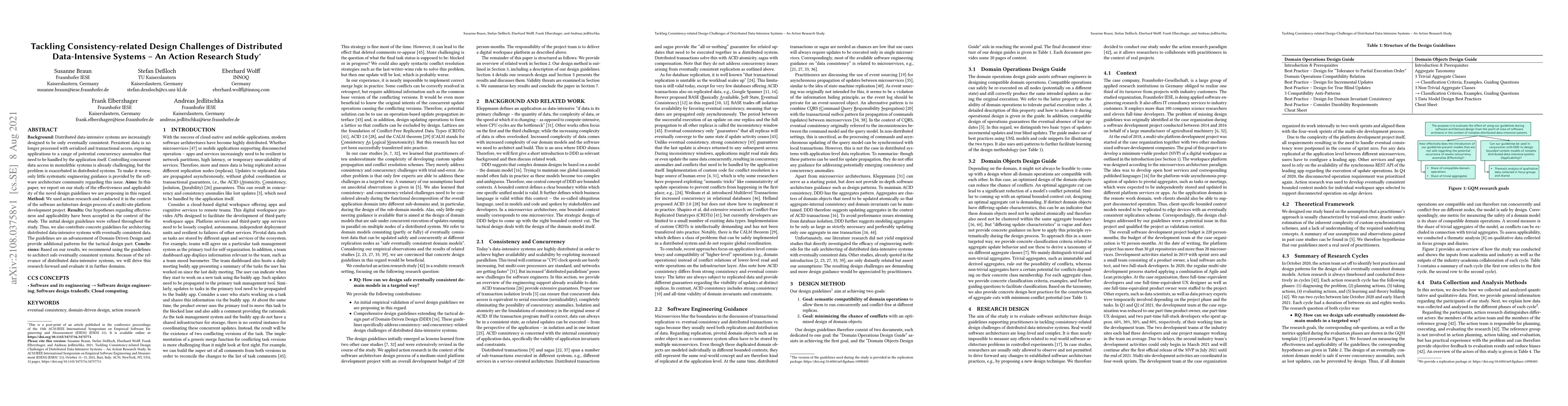 Background: Distributed data-intensive systems are increasingly designed to be only eventually consistent. Persistent data is no longer processed with serialized and transactional access, exposing applications to a range of potential concurrency anomalies that need to be handled by the application itself. Controlling concurrent data access in monolithic systems is already challenging, but the problem is exacerbated in distributed systems. To make it worse, only little systematic engineering guidance is provided by the software architecture community regarding this issue. Aims: In this paper, we report on our study of the effectiveness and applicability of the novel design guidelines we are proposing in this regard. Method: We used action research and conducted it in the context of the software architecture design process of a multi-site platform development project. Results: Our hypotheses regarding effectiveness and applicability have been accepted in the context of the study. The initial design guidelines were refined throughout the study. Thus, we also contribute concrete guidelines for architecting distributed data-intensive systems with eventually consistent data. The guidelines are an advancement of Domain-Driven Design and provide additional patterns for the tactical design part. Conclusions: Based on our results, we recommend using the guidelines to architect safe eventually consistent systems. Because of the relevance of distributed data-intensive systems, we will drive this research forward and evaluate it in further domains.