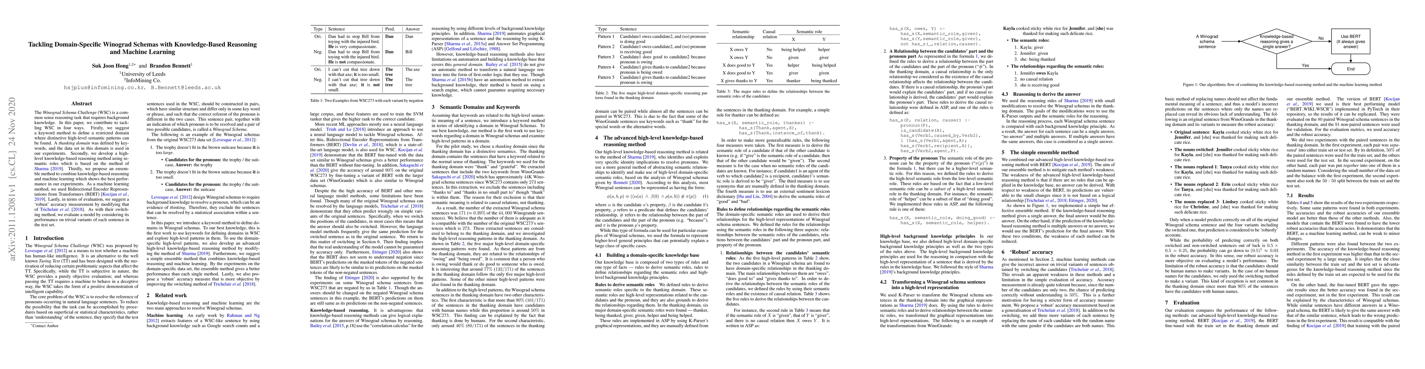 This paper tackles the Winograd Schema Challenge with a keyword-based domain definition, a high-level knowledge-based reasoning method, and an ensemble approach combining this with machine learning to achieve the best performance. It proposes a new evaluation metric and uses BERT as a machine learning model to demonstrate its effectiveness in common-sense reasoning tasks.