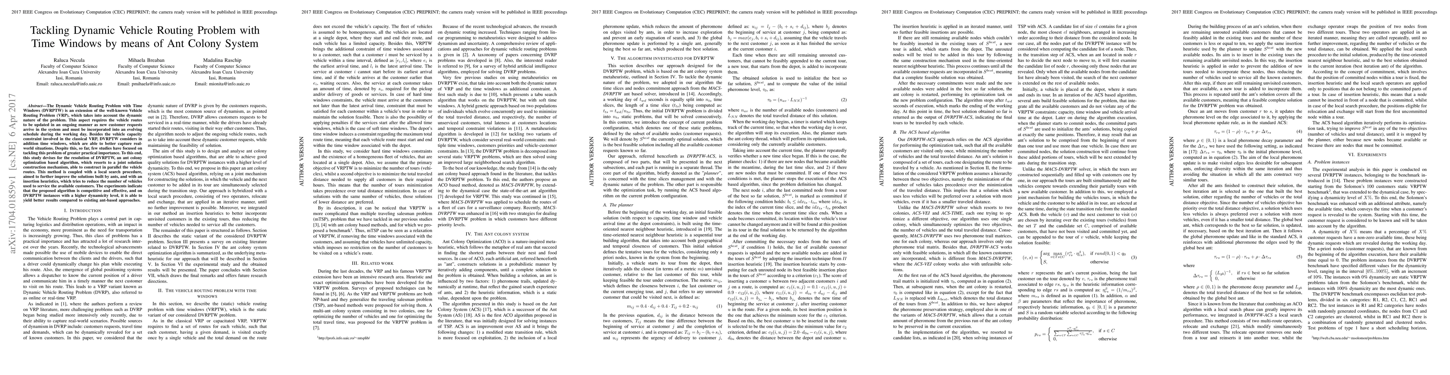 This paper proposes an ant colony optimization algorithm to solve the Dynamic Vehicle Routing Problem with Time Windows (DVRPTW), featuring a parallel route construction mechanism and local search to enhance solution quality. Experimental results show the algorithm's competitiveness and effectiveness, especially in highly dynamic scenarios.