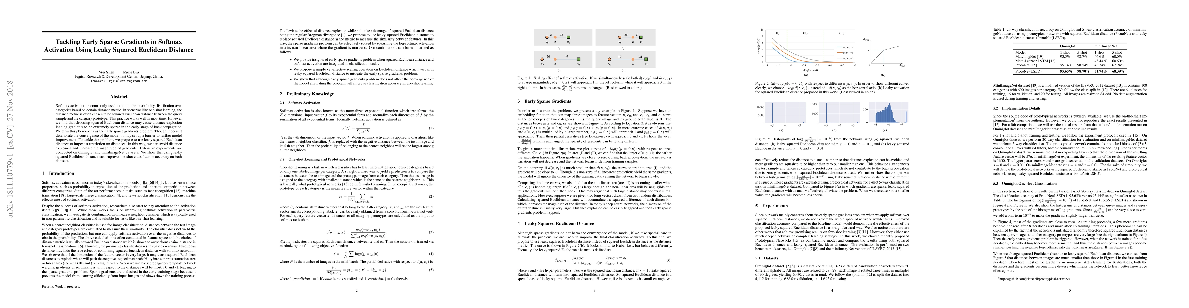 Softmax activation is commonly used to output the probability distribution over categories based on certain distance metric. In scenarios like one-shot learning, the distance metric is often chosen to be squared Euclidean distance between the query sample and the category prototype. This practice works well in most time. However, we find that choosing squared Euclidean distance may cause distance explosion leading gradients to be extremely sparse in the early stage of back propagation. We term this phenomena as the early sparse gradients problem. Though it doesn't deteriorate the convergence of the model, it may set up a barrier to further model improvement. To tackle this problem, we propose to use leaky squared Euclidean distance to impose a restriction on distances. In this way, we can avoid distance explosion and increase the magnitude of gradients. Extensive experiments are conducted on Omniglot and miniImageNet datasets. We show that using leaky squared Euclidean distance can improve one-shot classification accuracy on both datasets.