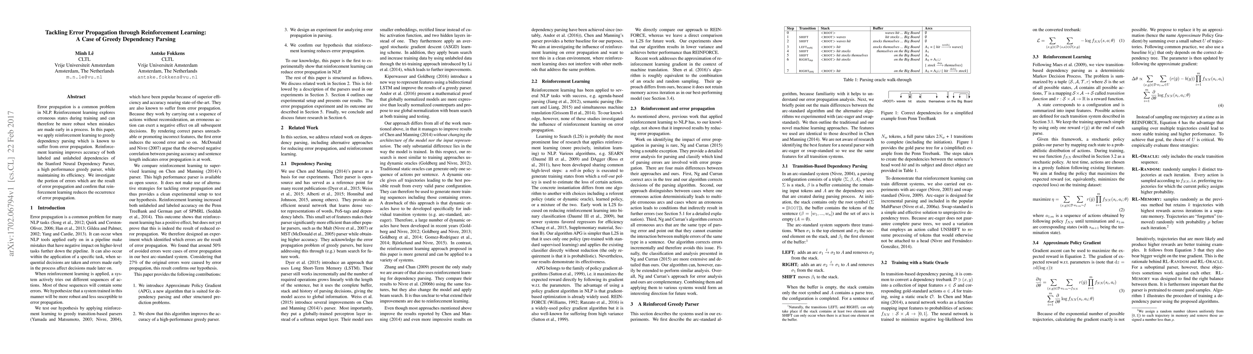 This paper applies reinforcement learning to mitigate error propagation in greedy dependency parsing, demonstrating improved accuracy in both labeled and unlabeled dependencies for the Stanford Neural Dependency Parser while maintaining efficiency, and confirming a reduction in error propagation occurrences.