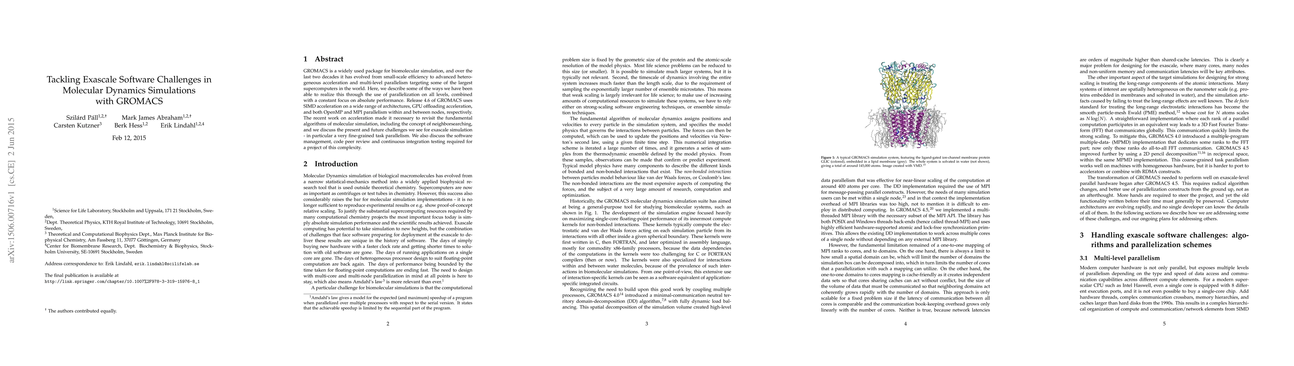This paper discusses the advancements in GROMACS for exascale molecular dynamics simulations, focusing on parallelization strategies and performance optimization. It highlights the use of SIMD, GPU acceleration, and MPI/OpenMP parallelism, and addresses the challenges of fine-grained task parallelism and software management for such complex simulations.