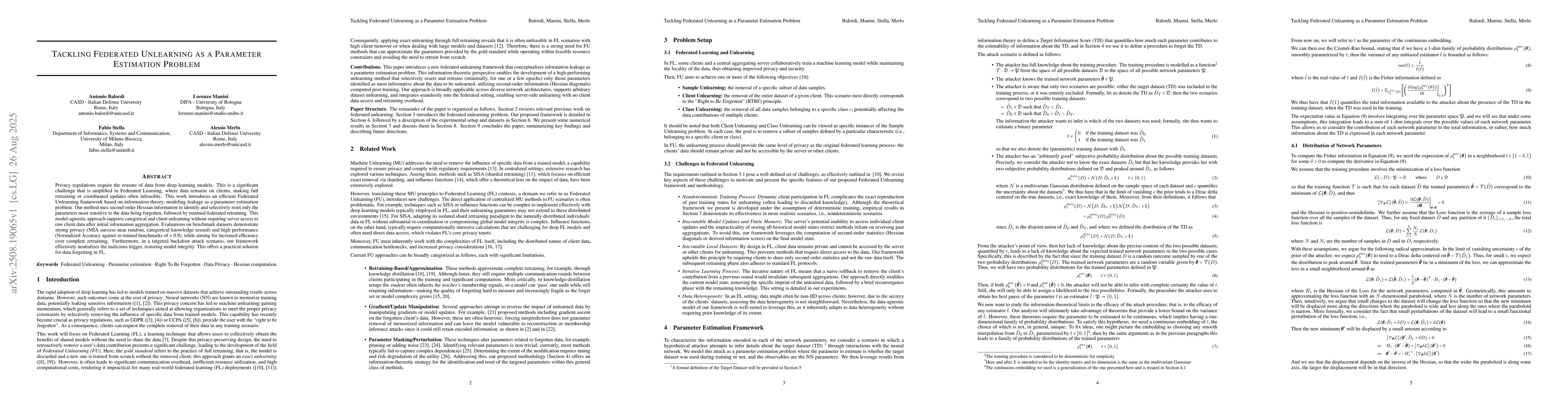 Privacy regulations require the erasure of data from deep learning models. This is a significant challenge that is amplified in Federated Learning, where data remains on clients, making full retraining or coordinated updates often infeasible. This work introduces an efficient Federated Unlearning framework based on information theory, modeling leakage as a parameter estimation problem. Our method uses second-order Hessian information to identify and selectively reset only the parameters most sensitive to the data being forgotten, followed by minimal federated retraining. This model-agnostic approach supports categorical and client unlearning without requiring server access to raw client data after initial information aggregation. Evaluations on benchmark datasets demonstrate strong privacy (MIA success near random, categorical knowledge erased) and high performance (Normalized Accuracy against re-trained benchmarks of $\approx$ 0.9), while aiming for increased efficiency over complete retraining. Furthermore, in a targeted backdoor attack scenario, our framework effectively neutralizes the malicious trigger, restoring model integrity. This offers a practical solution for data forgetting in FL.
