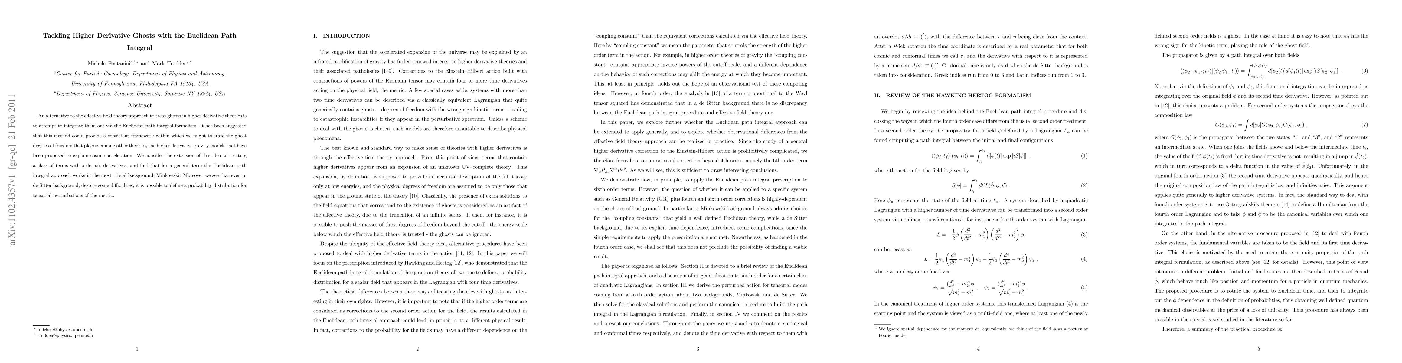 An alternative to the effective field theory approach to treat ghosts in higher derivative theories is to attempt to integrate them out via the Euclidean path integral formalism. It has been suggested that this method could provide a consistent framework within which we might tolerate the ghost degrees of freedom that plague, among other theories, the higher derivative gravity models that have been proposed to explain cosmic acceleration. We consider the extension of this idea to treating a class of terms with order six derivatives, and find that for a general term the Euclidean path integral approach works in the most trivial background, Minkowski. Moreover we see that even in de Sitter background, despite some difficulties, it is possible to define a probability distribution for tensorial perturbations of the metric.