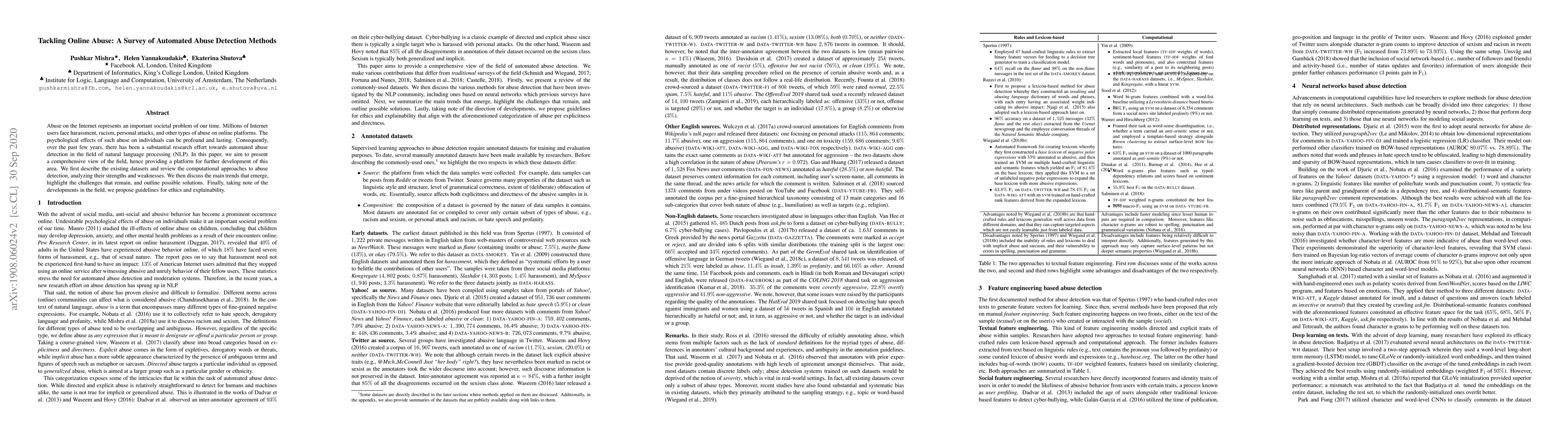 Abuse on the Internet represents an important societal problem of our time. Millions of Internet users face harassment, racism, personal attacks, and other types of abuse on online platforms. The psychological effects of such abuse on individuals can be profound and lasting. Consequently, over the past few years, there has been a substantial research effort towards automated abuse detection in the field of natural language processing (NLP). In this paper, we present a comprehensive survey of the methods that have been proposed to date, thus providing a platform for further development of this area. We describe the existing datasets and review the computational approaches to abuse detection, analyzing their strengths and limitations. We discuss the main trends that emerge, highlight the challenges that remain, outline possible solutions, and propose guidelines for ethics and explainability