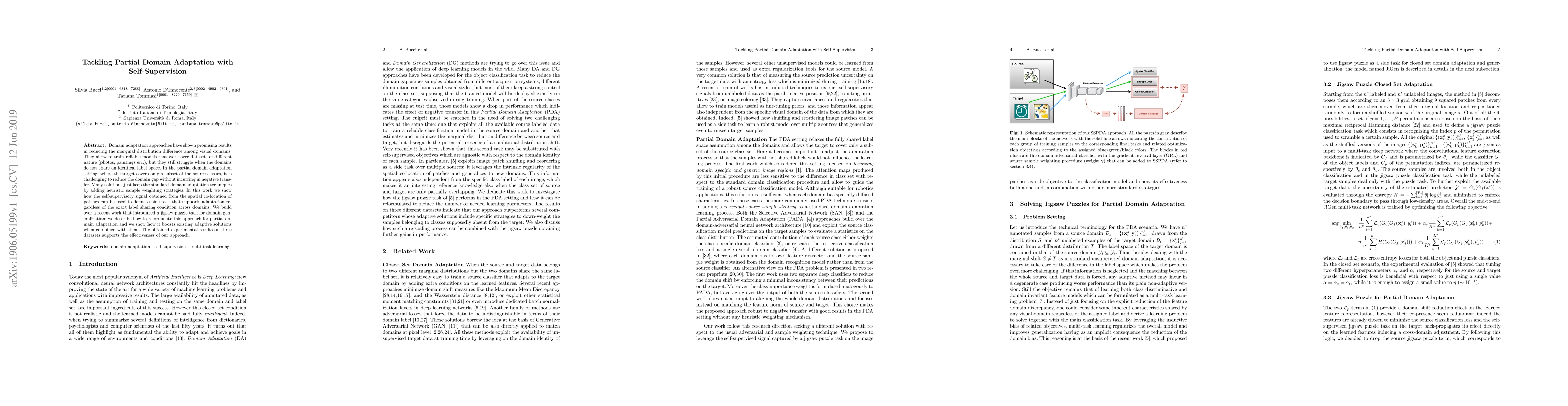 Domain adaptation approaches have shown promising results in reducing the marginal distribution difference among visual domains. They allow to train reliable models that work over datasets of different nature (photos, paintings etc), but they still struggle when the domains do not share an identical label space. In the partial domain adaptation setting, where the target covers only a subset of the source classes, it is challenging to reduce the domain gap without incurring in negative transfer. Many solutions just keep the standard domain adaptation techniques by adding heuristic sample weighting strategies. In this work we show how the self-supervisory signal obtained from the spatial co-location of patches can be used to define a side task that supports adaptation regardless of the exact label sharing condition across domains. We build over a recent work that introduced a jigsaw puzzle task for domain generalization: we describe how to reformulate this approach for partial domain adaptation and we show how it boosts existing adaptive solutions when combined with them. The obtained experimental results on three datasets supports the effectiveness of our approach.