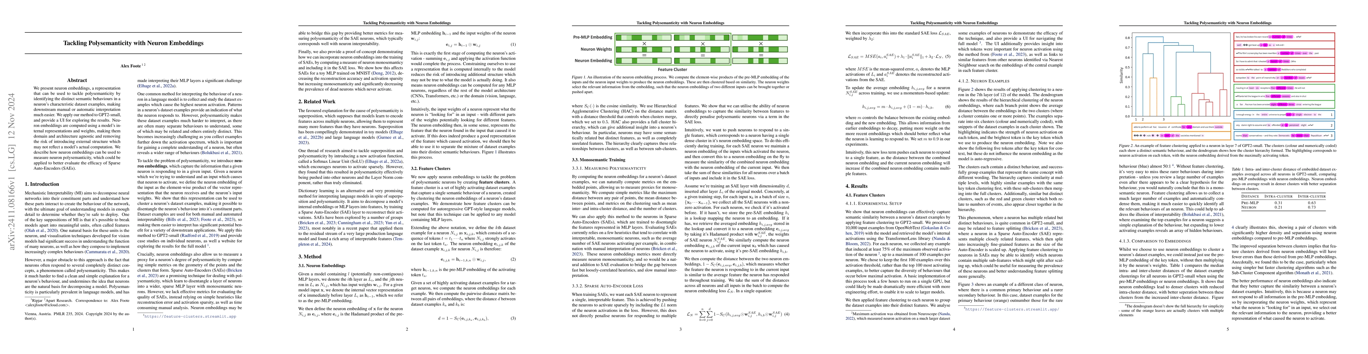 This paper introduces neuron embeddings to address polysemanticity in neural networks, enabling clearer interpretation of neurons' distinct semantic behaviors. Applied to GPT2-small, this method provides a UI for exploration, and it can be used to measure and evaluate the effectiveness of Sparse Auto-Encoders.