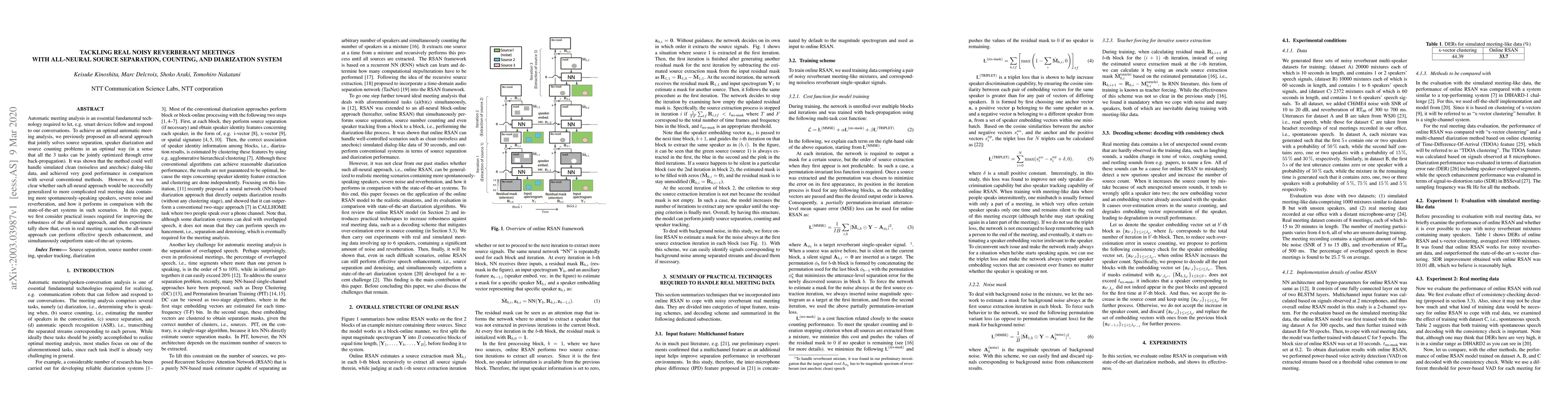 Automatic meeting analysis is an essential fundamental technology required to let, e.g. smart devices follow and respond to our conversations. To achieve an optimal automatic meeting analysis, we previously proposed an all-neural approach that jointly solves source separation, speaker diarization and source counting problems in an optimal way (in a sense that all the 3 tasks can be jointly optimized through error back-propagation). It was shown that the method could well handle simulated clean (noiseless and anechoic) dialog-like data, and achieved very good performance in comparison with several conventional methods. However, it was not clear whether such all-neural approach would be successfully generalized to more complicated real meeting data containing more spontaneously-speaking speakers, severe noise and reverberation, and how it performs in comparison with the state-of-the-art systems in such scenarios. In this paper, we first consider practical issues required for improving the robustness of the all-neural approach, and then experimentally show that, even in real meeting scenarios, the all-neural approach can perform effective speech enhancement, and simultaneously outperform state-of-the-art systems.