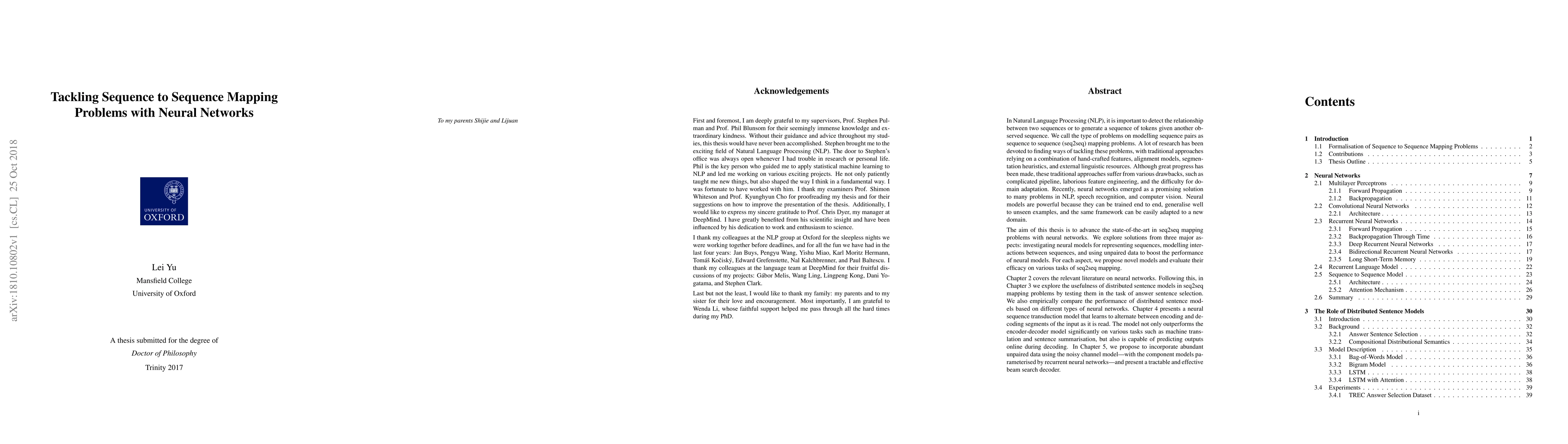 In Natural Language Processing (NLP), it is important to detect the relationship between two sequences or to generate a sequence of tokens given another observed sequence. We call the type of problems on modelling sequence pairs as sequence to sequence (seq2seq) mapping problems. A lot of research has been devoted to finding ways of tackling these problems, with traditional approaches relying on a combination of hand-crafted features, alignment models, segmentation heuristics, and external linguistic resources. Although great progress has been made, these traditional approaches suffer from various drawbacks, such as complicated pipeline, laborious feature engineering, and the difficulty for domain adaptation. Recently, neural networks emerged as a promising solution to many problems in NLP, speech recognition, and computer vision. Neural models are powerful because they can be trained end to end, generalise well to unseen examples, and the same framework can be easily adapted to a new domain. The aim of this thesis is to advance the state-of-the-art in seq2seq mapping problems with neural networks. We explore solutions from three major aspects: investigating neural models for representing sequences, modelling interactions between sequences, and using unpaired data to boost the performance of neural models. For each aspect, we propose novel models and evaluate their efficacy on various tasks of seq2seq mapping.