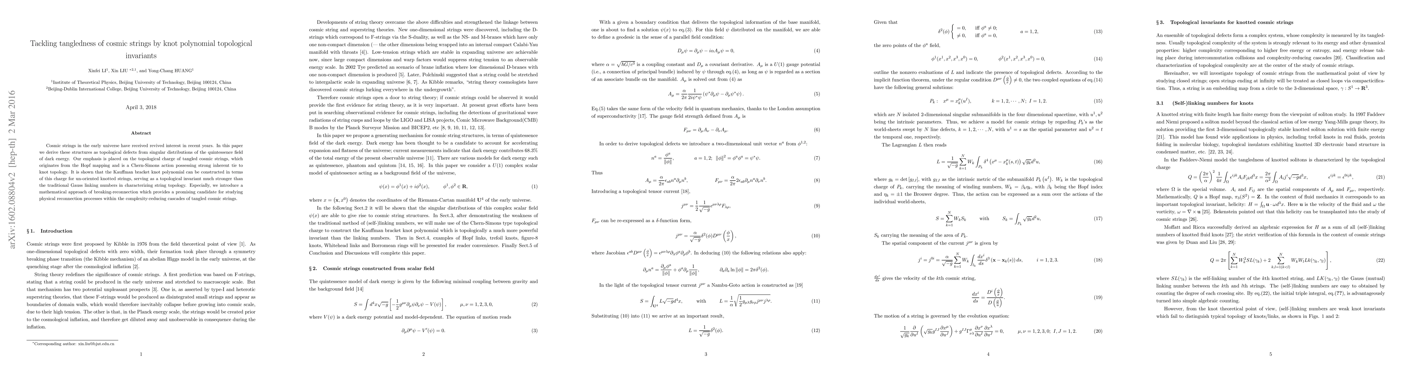 This paper derives cosmic strings as topological defects from the quintessence field of dark energy and uses the Hopf mapping to analyze their topological charge. It introduces the Kauffman bracket knot polynomial as a stronger invariant than traditional Gauss linking numbers to characterize tangled cosmic strings, proposing a mathematical approach for studying their physical reconnection processes.