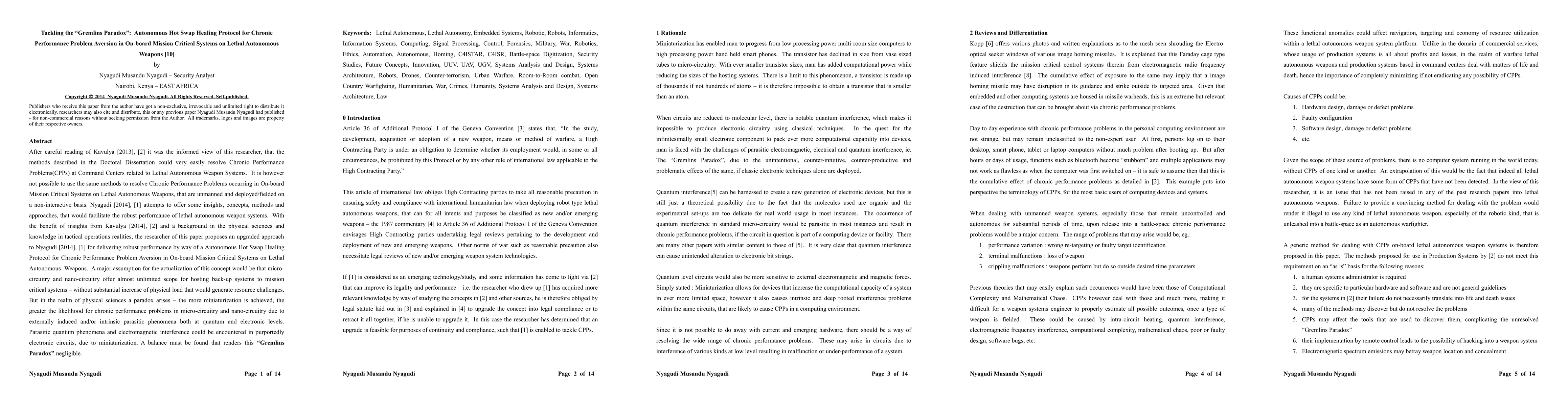 Summary: This paper explores the "Gremlins Paradox" and proposes an autonomous hot swap healing protocol to address chronic performance issues in mission-critical systems for lethal autonomous weapons, aiming to enhance system reliability and operational effectiveness.