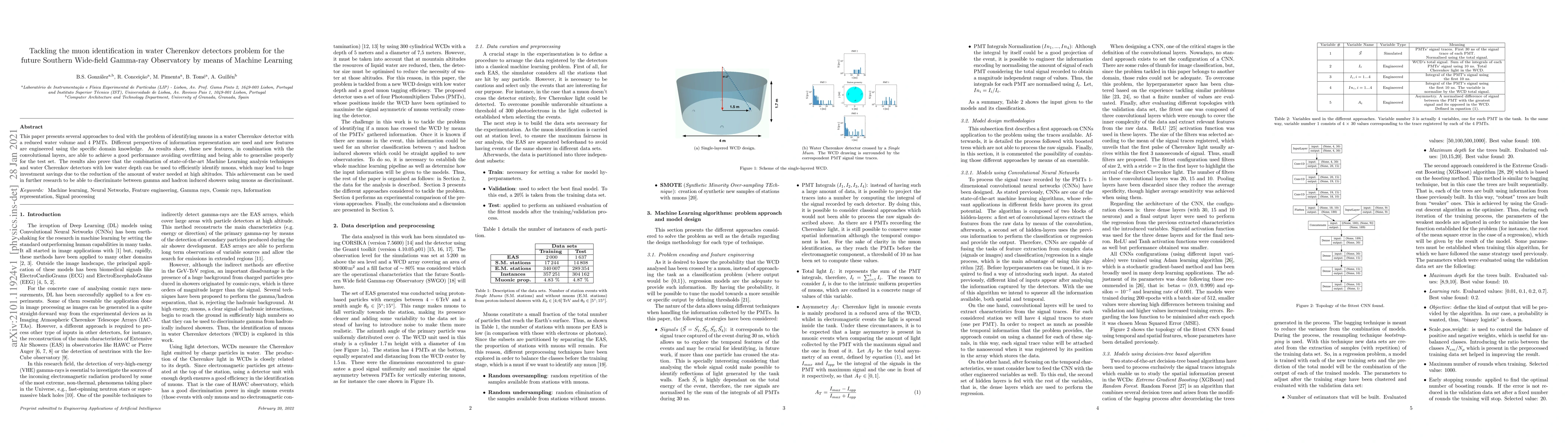 This paper presents several approaches to deal with the problem of identifying muons in a water Cherenkov detector with a reduced water volume and 4 PMTs. Different perspectives of information representation are used and new features are engineered using the specific domain knowledge. As results show, these new features, in combination with the convolutional layers, are able to achieve a good performance avoiding overfitting and being able to generalise properly for the test set. The results also prove that the combination of state-of-the-art Machine Learning analysis techniques and water Cherenkov detectors with low water depth can be used to efficiently identify muons, which may lead to huge investment savings due to the reduction of the amount of water needed at high altitudes. This achievement can be used in further research to be able to discriminate between gamma and hadron induced showers using muons as discriminant.