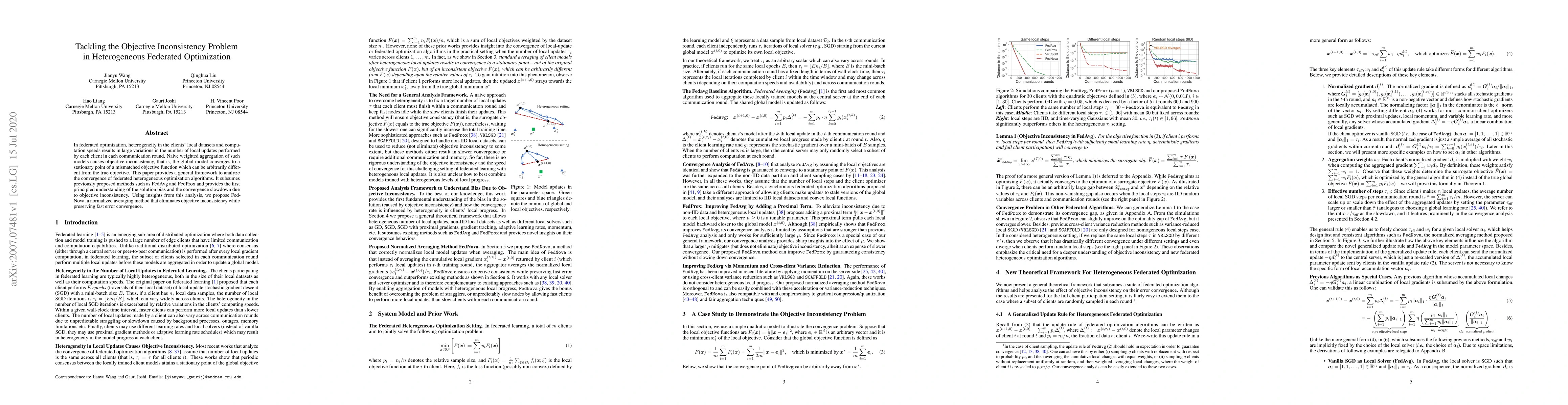 This paper tackles objective inconsistency in heterogeneous federated optimization by proposing a framework to analyze convergence and introducing FedNova, a method that eliminates inconsistencies while preserving fast error convergence.