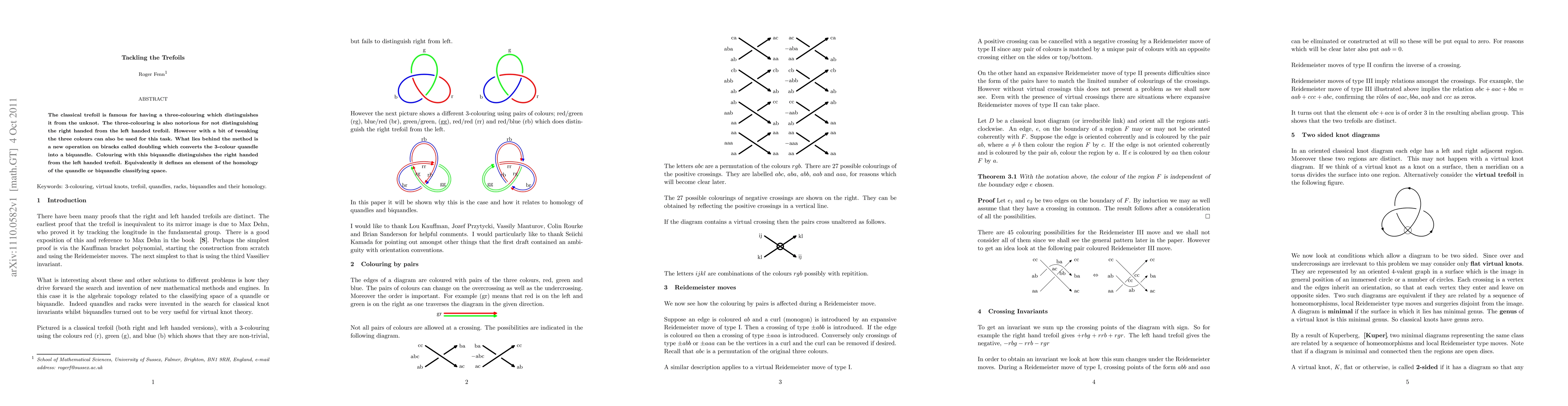 The classical trefoil is famous for having a three-colouring which distinguishes it from the unknot. The three-colouring is also notorious for not distinguishing the right handed from the left handed trefoil. However with a bit of tweaking the three colours can also be used for this task. What lies behind the method is a new operation on biracks called doubling which converts the 3-colour quandle into a biquandle. Colouring with this biquandle distinguishes the right handed from the left handed trefoil. Equivalently it defines an element of the homology of the quandle or biquandle classifying space.