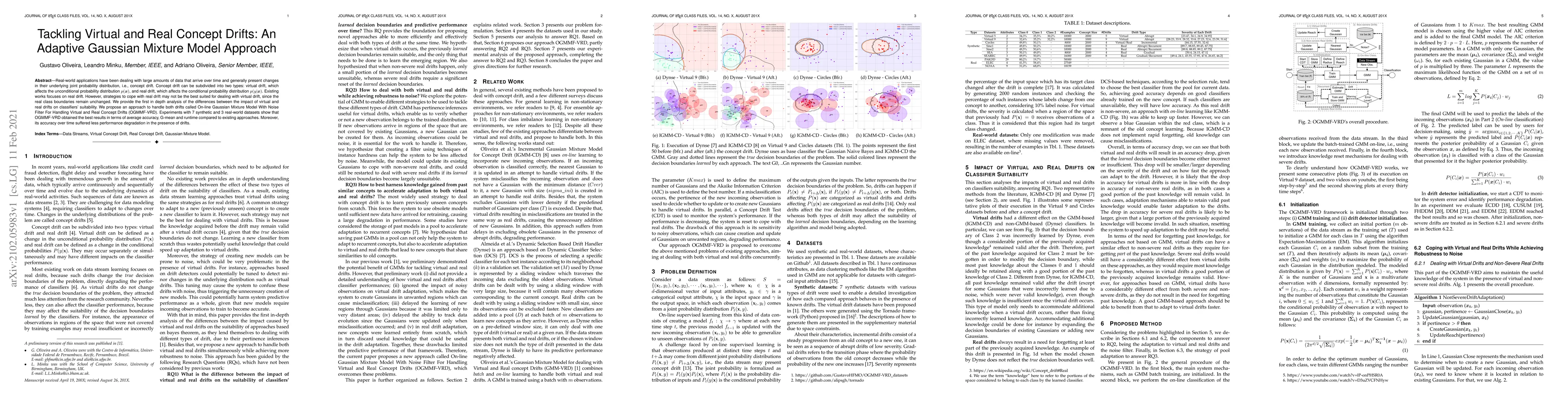 This paper investigates the differences between virtual and real concept drifts and proposes a new adaptive Gaussian Mixture Model (OGMMF-VRD) to handle both types effectively. Experimental results on 10 datasets show that the proposed model outperforms existing methods in accuracy, G-mean, and runtime, especially in maintaining performance over time.