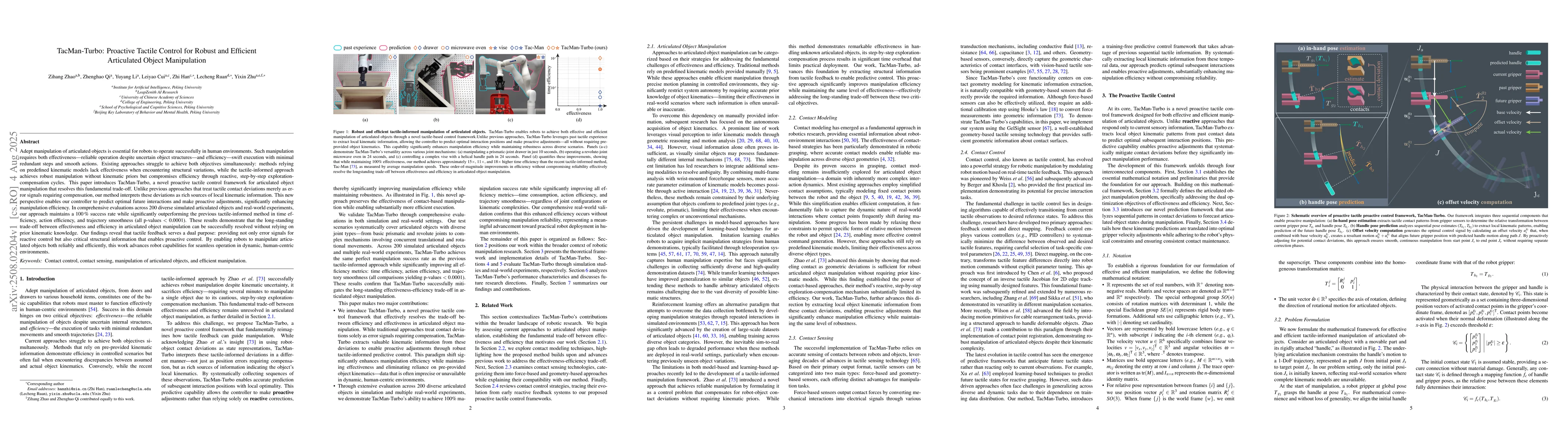 The paper introduces TacMan-Turbo, a proactive tactile control framework for articulated object manipulation that predicts optimal future interactions and makes proactive adjustments based on tactile deviations as local kinematic information sources.