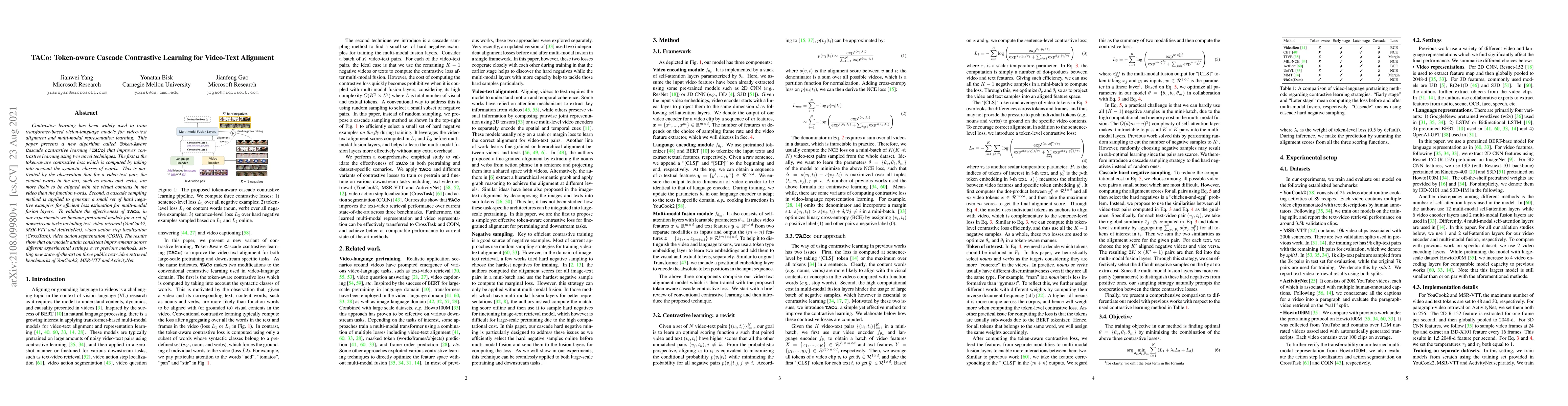 The paper introduces TACo, a Token-Aware Cascade Contrastive Learning algorithm for video-text alignment, utilizing a token-aware contrastive loss and a cascade sampling method to generate hard negative examples. Experiments show TACo achieves state-of-the-art results on several text-video retrieval benchmarks.