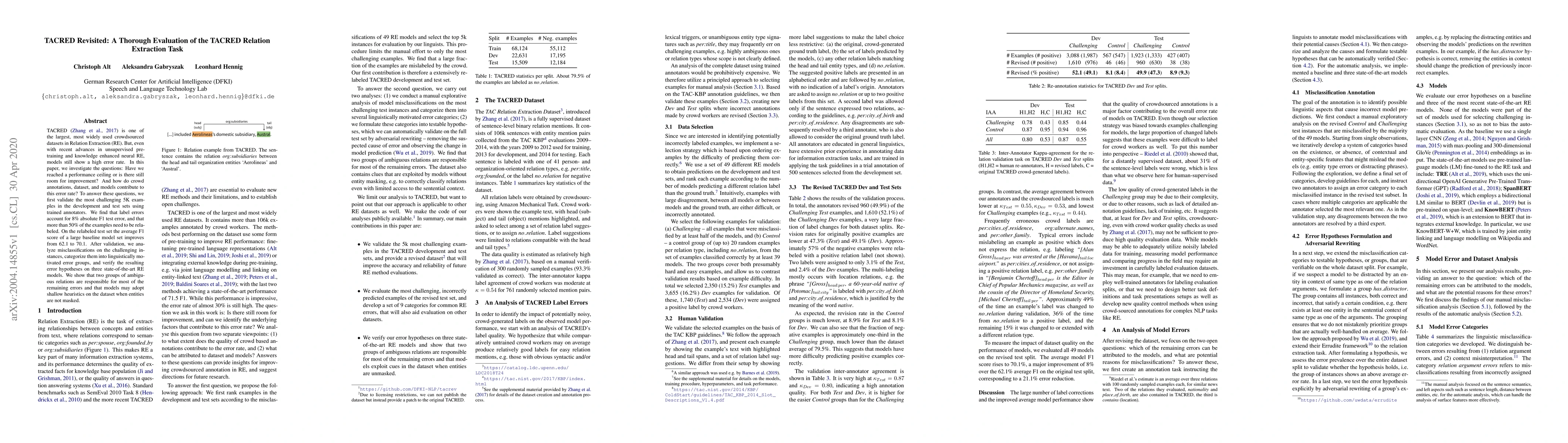 TACRED (Zhang et al., 2017) is one of the largest, most widely used crowdsourced datasets in Relation Extraction (RE). But, even with recent advances in unsupervised pre-training and knowledge enhanced neural RE, models still show a high error rate. In this paper, we investigate the questions: Have we reached a performance ceiling or is there still room for improvement? And how do crowd annotations, dataset, and models contribute to this error rate? To answer these questions, we first validate the most challenging 5K examples in the development and test sets using trained annotators. We find that label errors account for 8% absolute F1 test error, and that more than 50% of the examples need to be relabeled. On the relabeled test set the average F1 score of a large baseline model set improves from 62.1 to 70.1. After validation, we analyze misclassifications on the challenging instances, categorize them into linguistically motivated error groups, and verify the resulting error hypotheses on three state-of-the-art RE models. We show that two groups of ambiguous relations are responsible for most of the remaining errors and that models may adopt shallow heuristics on the dataset when entities are not masked.