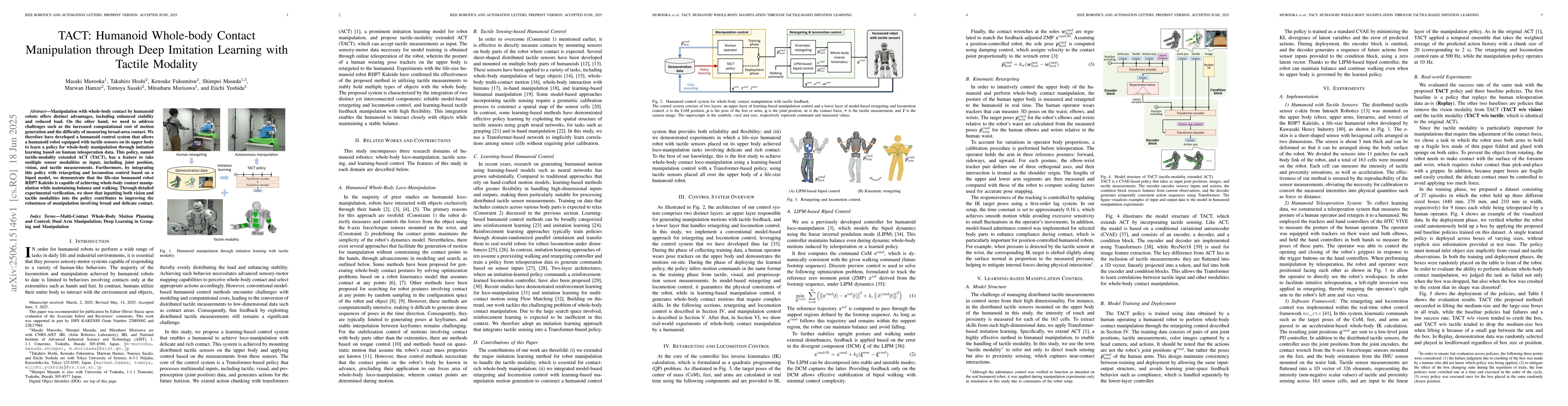 This research introduces TACT, a control system enabling humanoid robots to learn whole-body contact manipulation via imitation learning from human teleoperation data. TACT utilizes multiple sensor inputs, including joint position, vision, and tactile measurements, enhancing robustness in broad and delicate contact tasks while maintaining balance and walking.