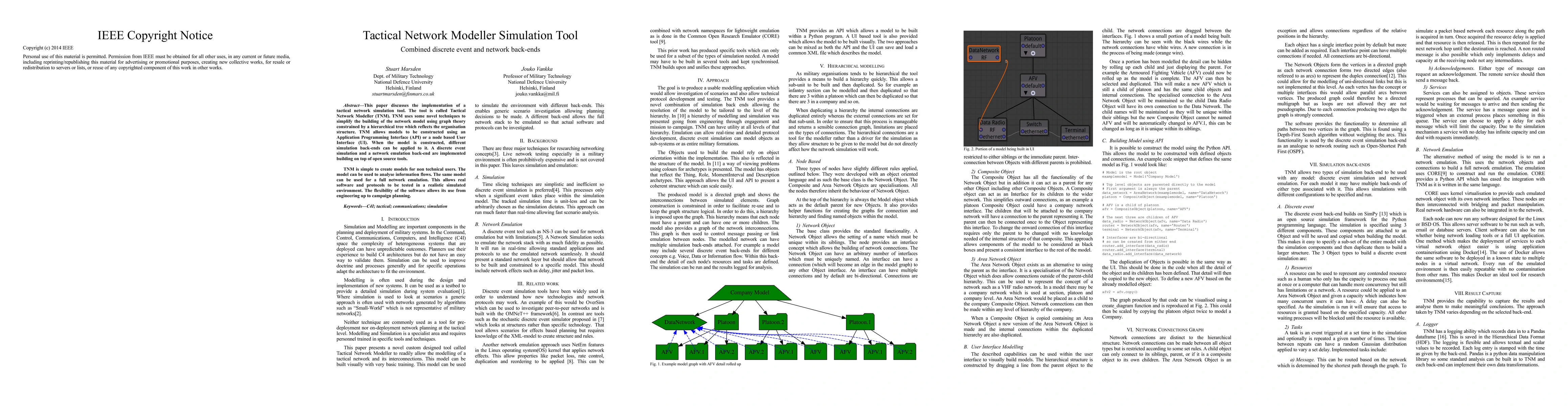 This paper introduces Tactical Network Modeller (TNM), a simulation tool combining discrete event and network back-ends. TNM simplifies network model construction using graph theory and hierarchical trees, offering both API and UI for model creation, and enabling analysis of information flows and full network emulation.