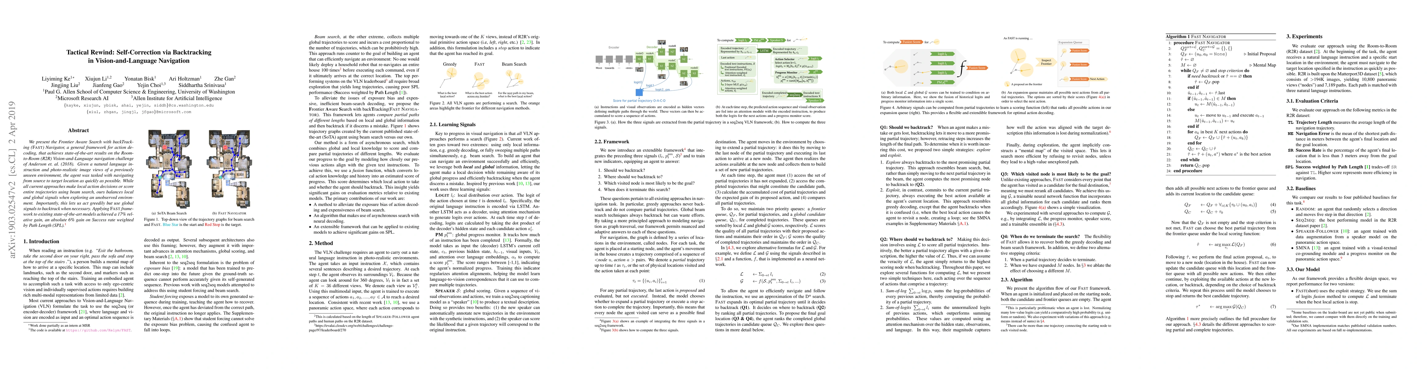 We present the Frontier Aware Search with backTracking (FAST) Navigator, a general framework for action decoding, that achieves state-of-the-art results on the Room-to-Room (R2R) Vision-and-Language navigation challenge of Anderson et. al. (2018). Given a natural language instruction and photo-realistic image views of a previously unseen environment, the agent was tasked with navigating from source to target location as quickly as possible. While all current approaches make local action decisions or score entire trajectories using beam search, ours balances local and global signals when exploring an unobserved environment. Importantly, this lets us act greedily but use global signals to backtrack when necessary. Applying FAST framework to existing state-of-the-art models achieved a 17% relative gain, an absolute 6% gain on Success rate weighted by Path Length (SPL).