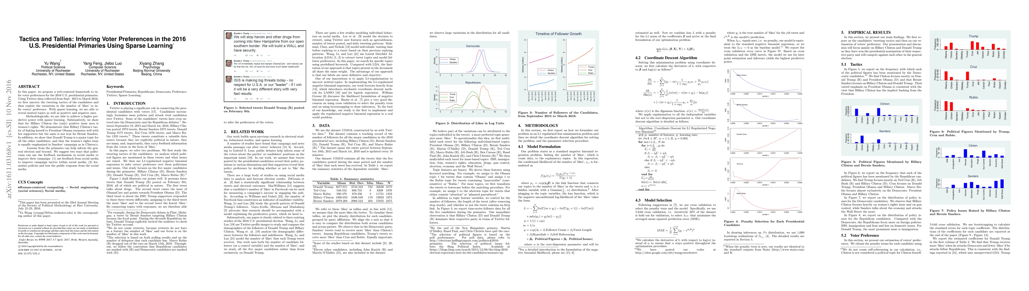 In this paper, we propose a web-centered framework to infer voter preferences for the 2016 U.S. presidential primaries. Using Twitter data collected from Sept. 2015 to March 2016, we first uncover the tweeting tactics of the candidates and then exploit the variations in the number of 'likes' to infer voters' preference. With sparse learning, we are able to reveal neutral topics as well as positive and negative ones. Methodologically, we are able to achieve a higher predictive power with sparse learning. Substantively, we show that for Hillary Clinton the (only) positive issue area is women's rights. We demonstrate that Hillary Clinton's tactic of linking herself to President Obama resonates well with her supporters but the same is not true for Bernie Sanders. In addition, we show that Donald Trump is a major topic for all the other candidates, and that the women's rights issue is equally emphasized in Sanders' campaign as in Clinton's.