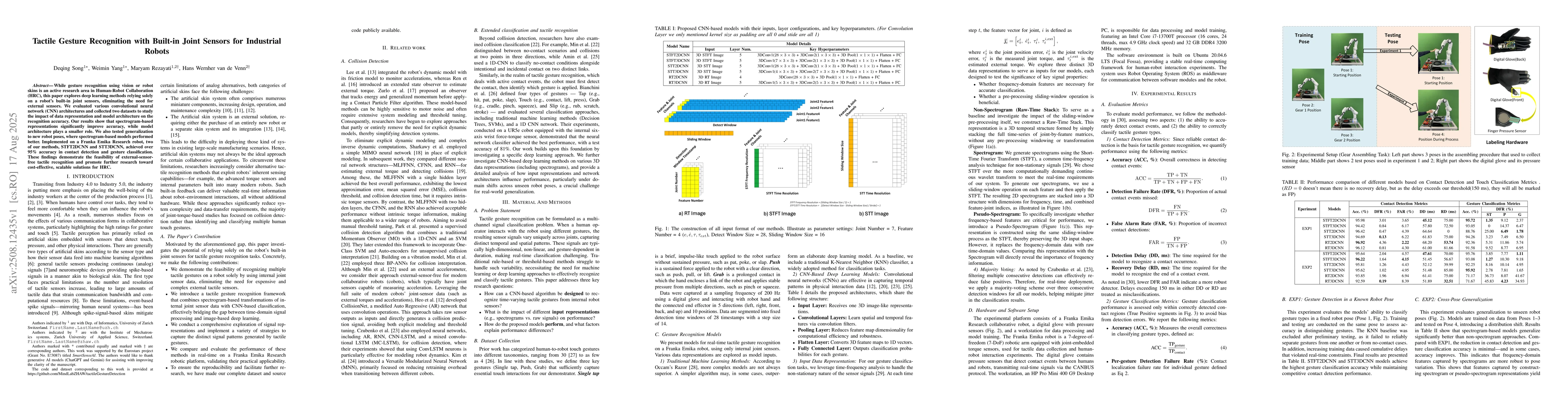 While gesture recognition using vision or robot skins is an active research area in Human-Robot Collaboration (HRC), this paper explores deep learning methods relying solely on a robot's built-in joint sensors, eliminating the need for external sensors. We evaluated various convolutional neural network (CNN) architectures and collected two datasets to study the impact of data representation and model architecture on the recognition accuracy. Our results show that spectrogram-based representations significantly improve accuracy, while model architecture plays a smaller role. We also tested generalization to new robot poses, where spectrogram-based models performed better. Implemented on a Franka Emika Research robot, two of our methods, STFT2DCNN and STT3DCNN, achieved over 95% accuracy in contact detection and gesture classification. These findings demonstrate the feasibility of external-sensor-free tactile recognition and promote further research toward cost-effective, scalable solutions for HRC.