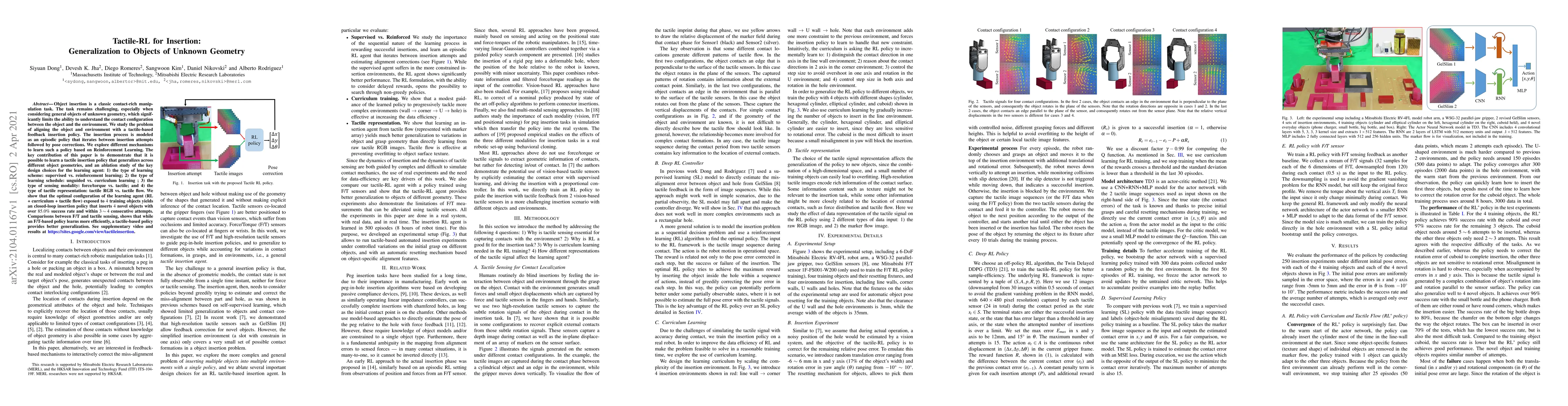 This paper investigates tactile-based reinforcement learning for object insertion tasks, demonstrating that a tactile insertion policy can generalize to objects of unknown geometry. The optimal configuration, using reinforcement learning with a curriculum schedule and tactile flow, achieves over 85% success rate for inserting novel objects within 3-4 attempts.