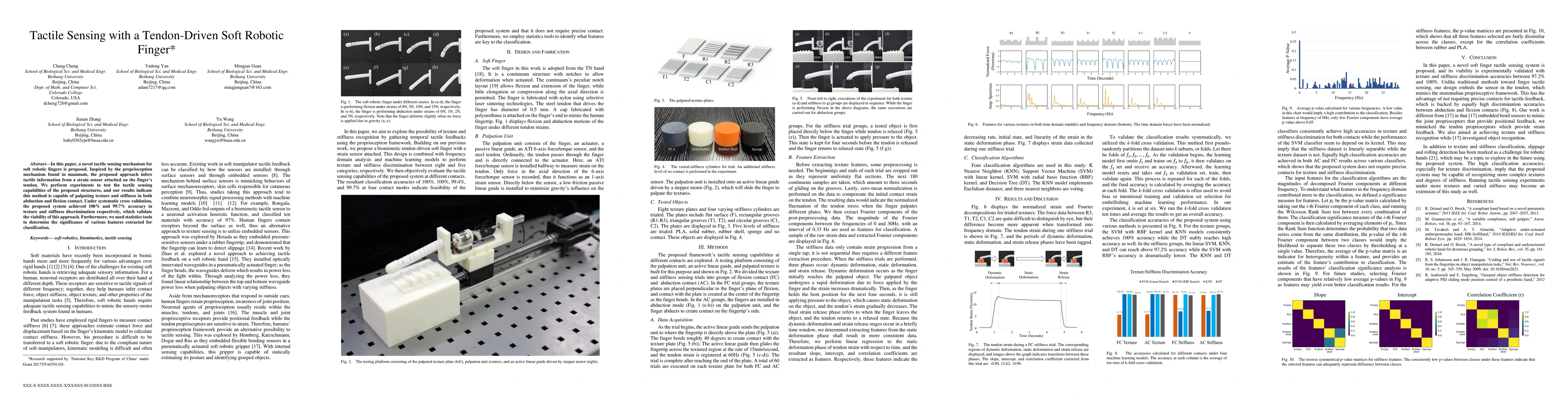 This paper proposes a novel tactile sensing mechanism for tendon-driven soft robotic fingers, utilizing strain sensors on the tendon to infer tactile information. The method achieves 100% accuracy in texture and 99.7% in stiffness discrimination, demonstrating its effectiveness in palpating different contact conditions.