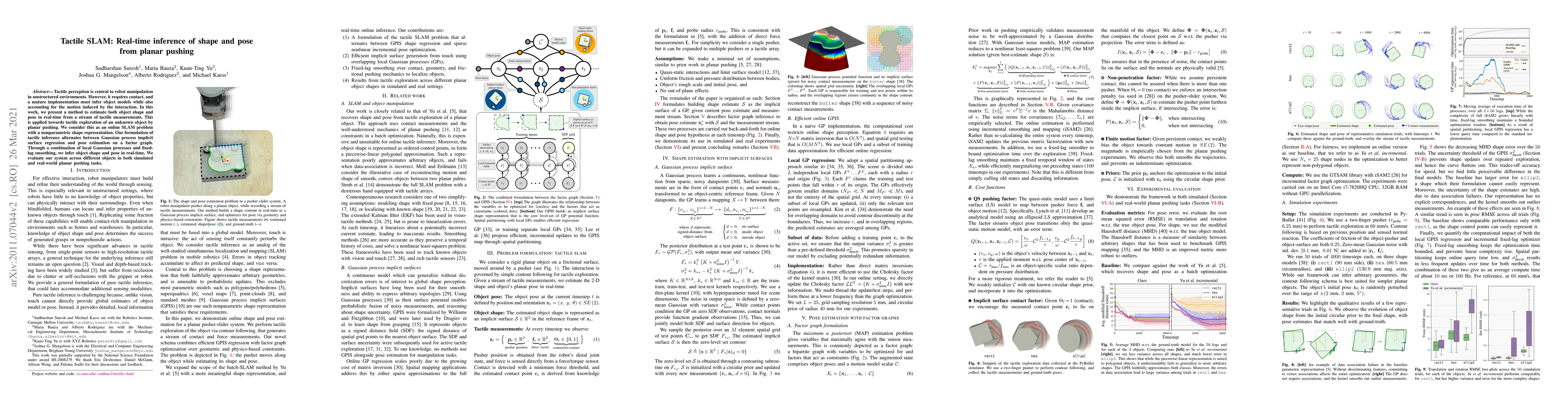 This paper presents a method for real-time inference of object shape and pose using tactile measurements during planar pushing, framing it as an online SLAM problem. The approach combines Gaussian process implicit surface regression and pose estimation on a factor graph to achieve real-time performance.
