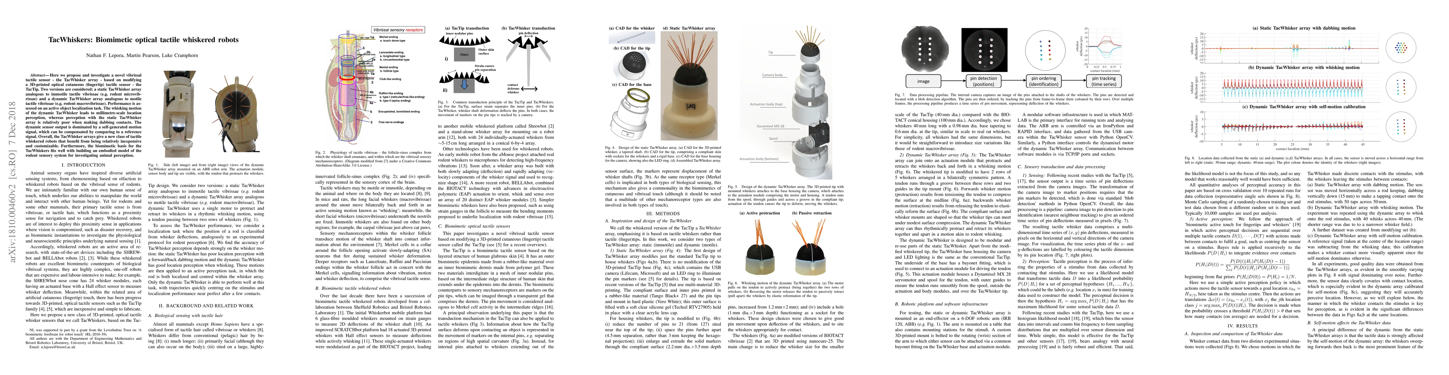 The TacWhisker array, a biomimetic optical tactile sensor inspired by rodent whiskers, is presented in two versions: static and dynamic. The dynamic version, with its whisking motion, enhances millimetre-scale object localization, while the static version struggles with dabbing contacts. The study highlights the potential for inexpensive and customizable tactile whiskered robots, useful for modeling rodent sensory systems.