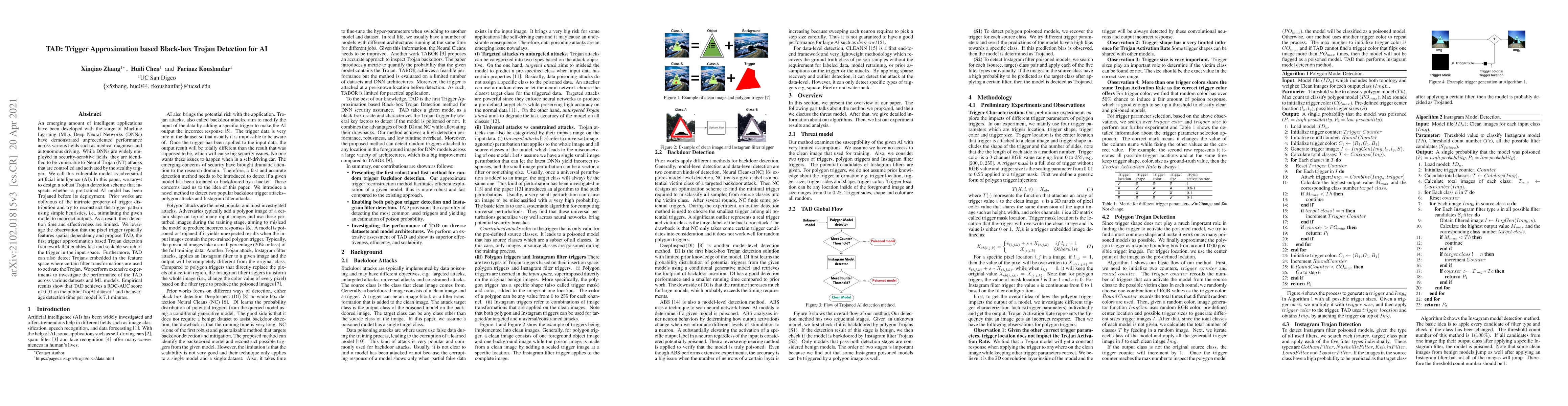This paper introduces TAD, a Trigger Approximation based Black-box Trojan Detection framework for AI, designed to detect Neural Trojans in pre-trained models. Unlike prior methods, TAD leverages spatial dependency of triggers for efficient detection, achieving a ROC-AUC score of 0.91 on the TrojAI dataset and an average detection time of 7.1 minutes.