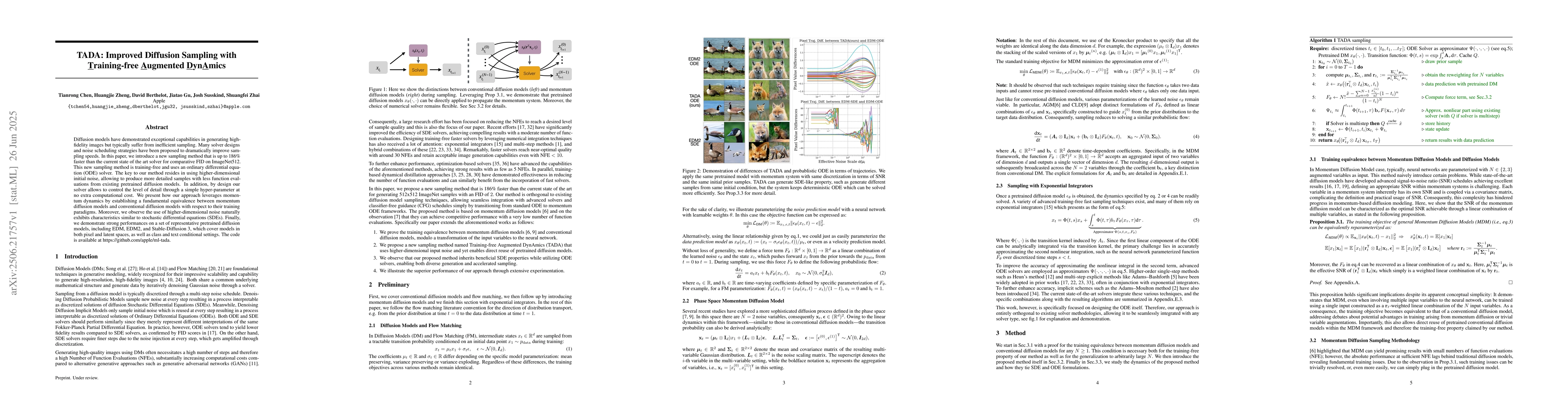 Diffusion models have demonstrated exceptional capabilities in generating high-fidelity images but typically suffer from inefficient sampling. Many solver designs and noise scheduling strategies have been proposed to dramatically improve sampling speeds. In this paper, we introduce a new sampling method that is up to $186\%$ faster than the current state of the art solver for comparative FID on ImageNet512. This new sampling method is training-free and uses an ordinary differential equation (ODE) solver. The key to our method resides in using higher-dimensional initial noise, allowing to produce more detailed samples with less function evaluations from existing pretrained diffusion models. In addition, by design our solver allows to control the level of detail through a simple hyper-parameter at no extra computational cost. We present how our approach leverages momentum dynamics by establishing a fundamental equivalence between momentum diffusion models and conventional diffusion models with respect to their training paradigms. Moreover, we observe the use of higher-dimensional noise naturally exhibits characteristics similar to stochastic differential equations (SDEs). Finally, we demonstrate strong performances on a set of representative pretrained diffusion models, including EDM, EDM2, and Stable-Diffusion 3, which cover models in both pixel and latent spaces, as well as class and text conditional settings. The code is available at https://github.com/apple/ml-tada.