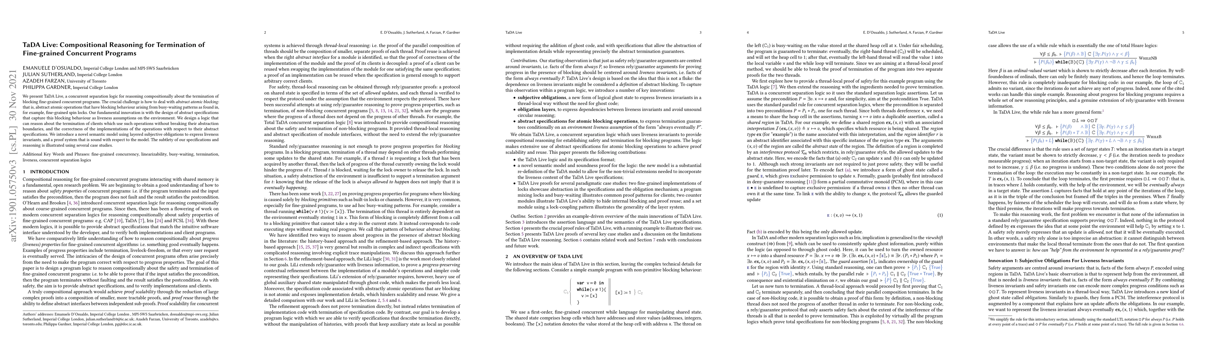 TaDA Live is a concurrent separation logic designed for compositional reasoning about the termination of fine-grained concurrent programs, particularly addressing blocking behavior from busy-waiting patterns. It introduces abstract specifications to capture liveness assumptions and employs a novel semantic model with layered subjective obligations to express liveness invariants.
