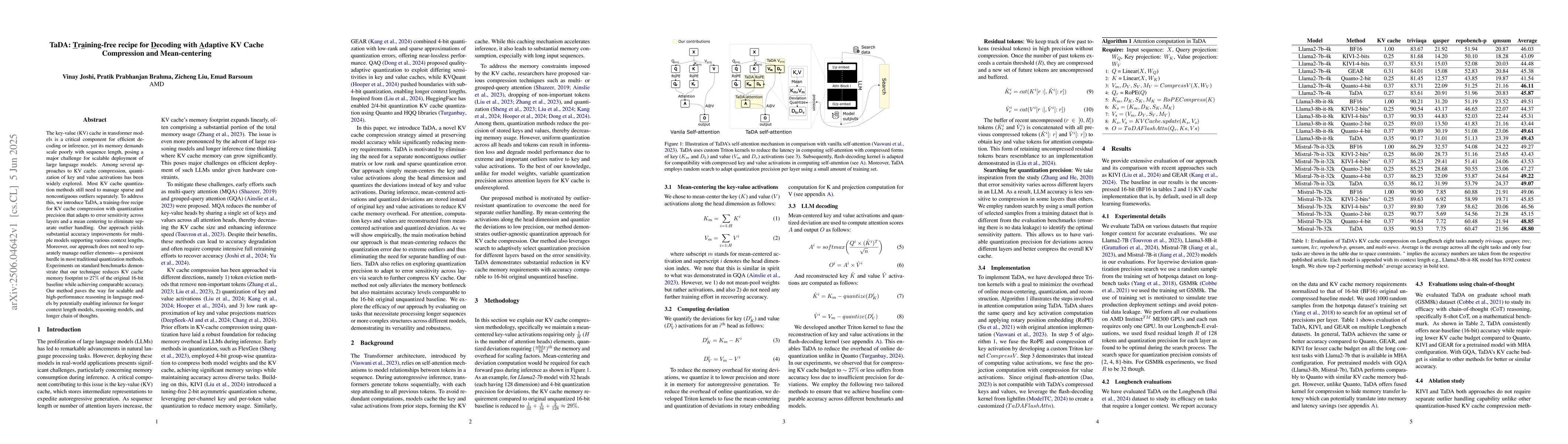 The paper introduces TaDA, a training-free recipe for KV cache compression in transformer models. It adapts quantization precision based on error sensitivity across layers and incorporates mean centering to handle outliers without separate management.