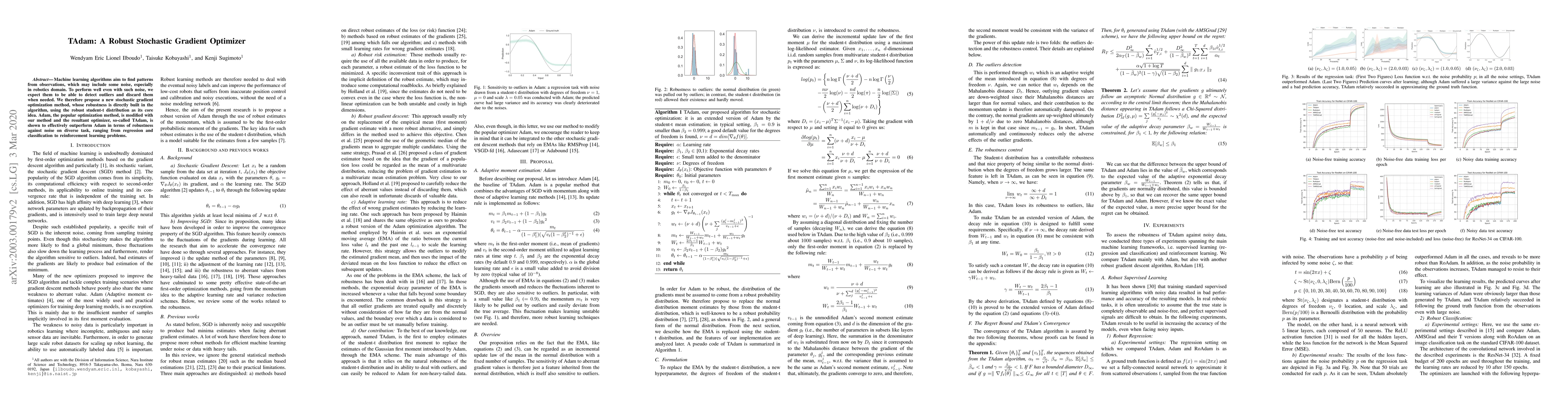 Machine learning algorithms aim to find patterns from observations, which may include some noise, especially in robotics domain. To perform well even with such noise, we expect them to be able to detect outliers and discard them when needed. We therefore propose a new stochastic gradient optimization method, whose robustness is directly built in the algorithm, using the robust student-t distribution as its core idea. Adam, the popular optimization method, is modified with our method and the resultant optimizer, so-called TAdam, is shown to effectively outperform Adam in terms of robustness against noise on diverse task, ranging from regression and classification to reinforcement learning problems. The implementation of our algorithm can be found at https://github.com/Mahoumaru/TAdam.git