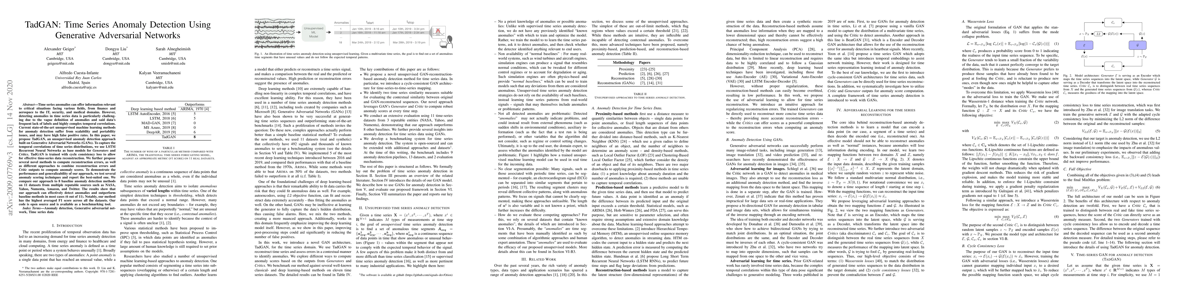 TadGAN employs Generative Adversarial Networks (GANs) with LSTM models to detect anomalies in time series data, addressing scalability and false positive issues. The method outperforms 8 baselines across 11 datasets, achieving the highest averaged F1 score and is available as an open-source benchmarking tool.