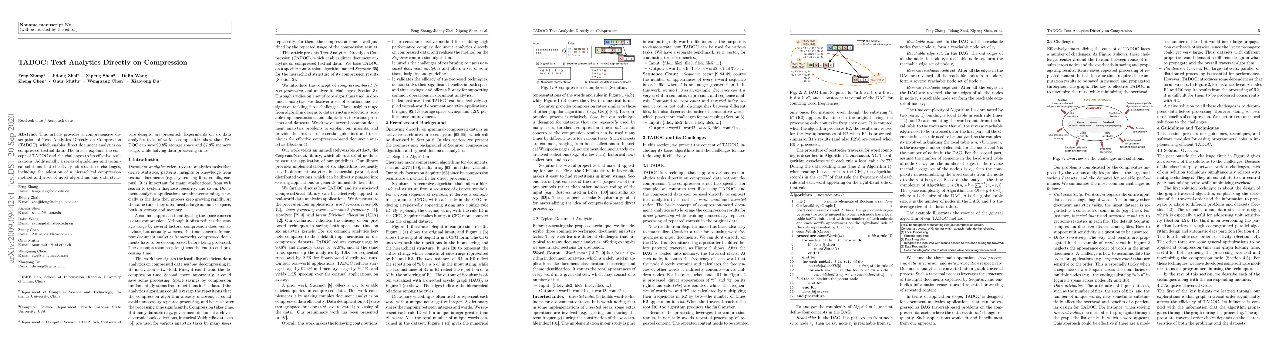 TADOC enables direct text analytics on compressed data, addressing challenges with hierarchical compression and novel algorithms. Experiments demonstrate significant storage and memory savings, along with reduced processing times.