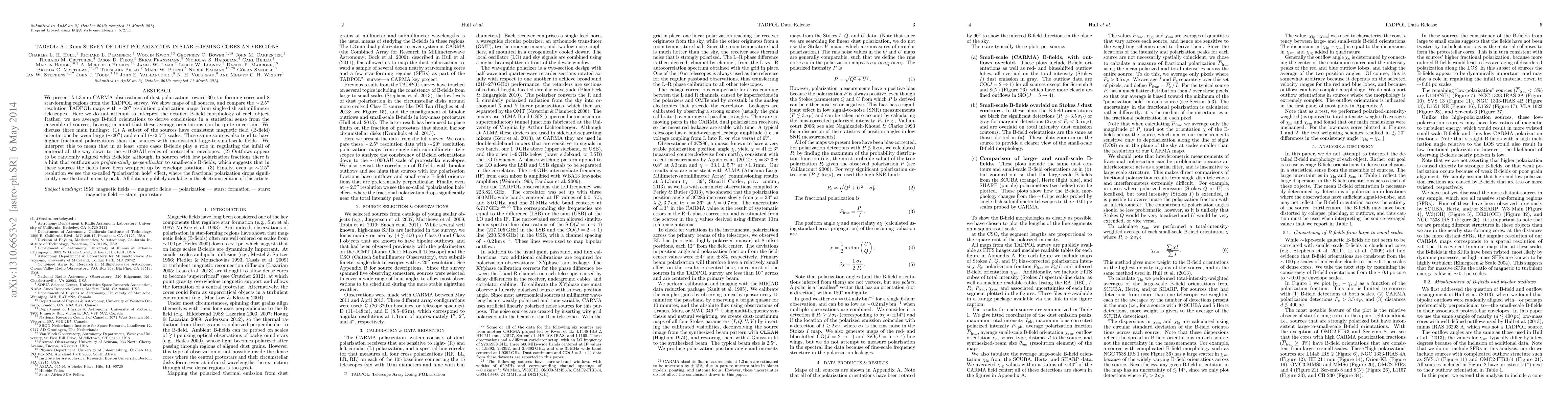 We present {\lambda}1.3 mm CARMA observations of dust polarization toward 30 star-forming cores and 8 star-forming regions from the TADPOL survey. We show maps of all sources, and compare the ~2.5" resolution TADPOL maps with ~20" resolution polarization maps from single-dish submillimeter telescopes. Here we do not attempt to interpret the detailed B-field morphology of each object. Rather, we use average B-field orientations to derive conclusions in a statistical sense from the ensemble of sources, bearing in mind that these average orientations can be quite uncertain. We discuss three main findings: (1) A subset of the sources have consistent magnetic field (B-field) orientations between large (~20") and small (~2.5") scales. Those same sources also tend to have higher fractional polarizations than the sources with inconsistent large-to-small-scale fields. We interpret this to mean that in at least some cases B-fields play a role in regulating the infall of material all the way down to the ~1000 AU scales of protostellar envelopes. (2) Outflows appear to be randomly aligned with B-fields; although, in sources with low polarization fractions there is a hint that outflows are preferentially perpendicular to small-scale B-fields, which suggests that in these sources the fields have been wrapped up by envelope rotation. (3) Finally, even at ~2.5" resolution we see the so-called "polarization hole" effect, where the fractional polarization drops significantly near the total intensity peak. All data are publicly available in the electronic edition of this article.