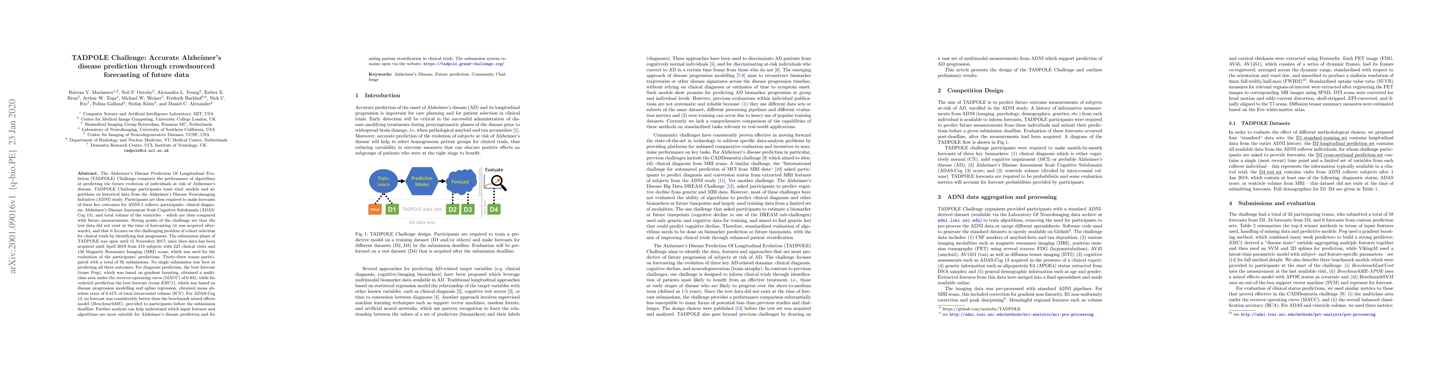 The TADPOLE Challenge evaluated algorithms for predicting Alzheimer's disease progression using historical data from ADNI, forecasting future clinical diagnosis, ADAS-Cog 13 scores, and ventricle volume. The best predictions varied by outcome, with gradient boosting excelling in diagnosis prediction and disease progression modeling in ventricle volume prediction, while no submission significantly outperformed the benchmark for ADAS-Cog 13.
