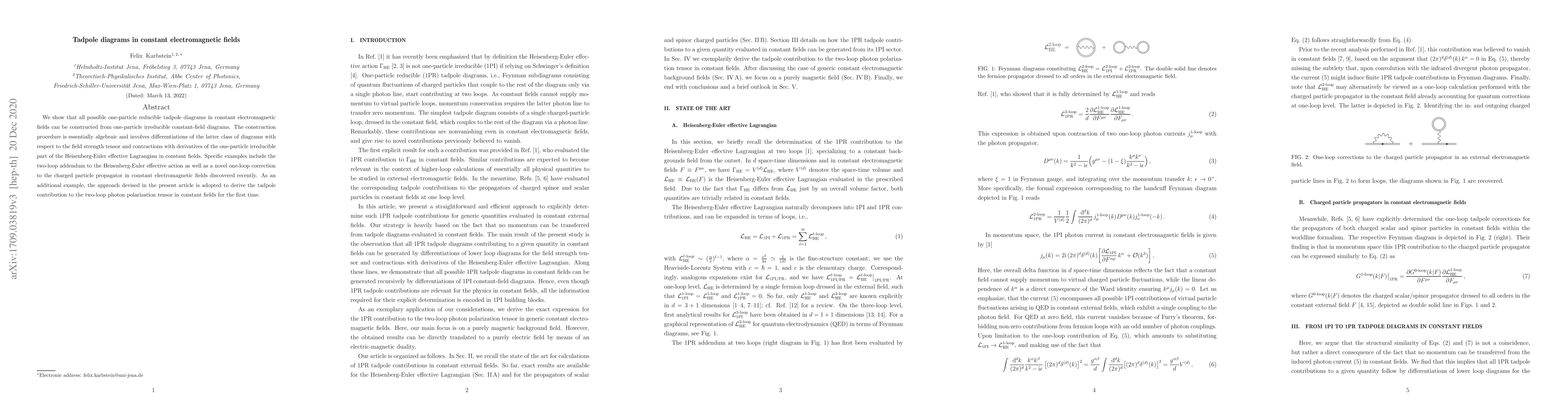 We show how all possible one-particle reducible tadpole diagrams in constant electromagnetic fields can be constructed from one-particle irreducible constant-field diagrams. The construction procedure is essentially algebraic and involves differentiations of the latter class of diagrams with respect to the field strength tensor and contractions with derivatives of the one-particle irreducible part of the Heisenberg-Euler effective Lagrangian in constant fields. Specific examples include the two-loop addendum to the Heisenberg-Euler effective action as well as a novel one-loop correction to the charged particle propagator in constant electromagnetic fields discovered recently. As an additional example, the approach devised in the present article is adopted to derive the tadpole contribution to the two-loop photon polarization tensor in constant fields for the first time.