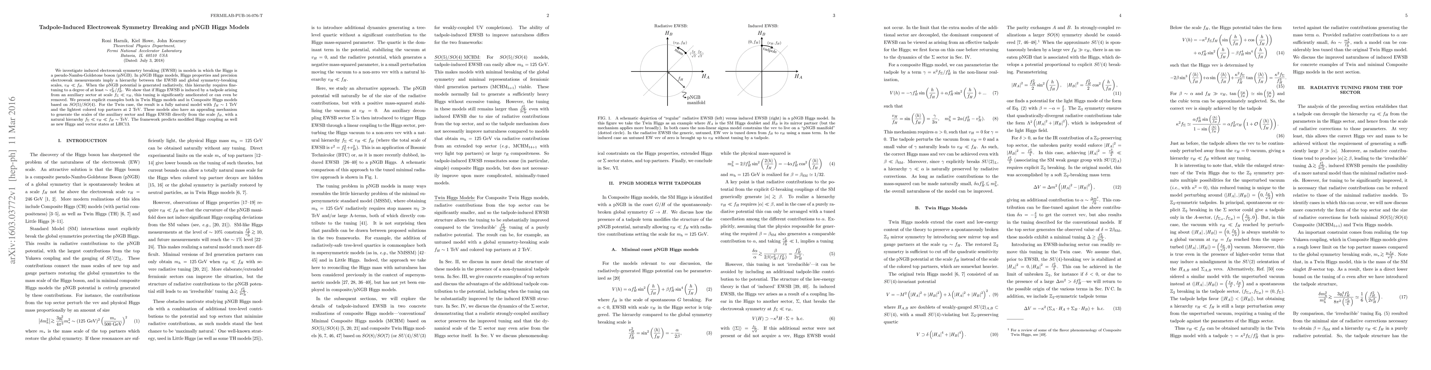 This paper explores models where electroweak symmetry breaking is induced by a tadpole from an auxiliary sector, significantly reducing the fine-tuning required in pseudo-Nambu-Goldstone boson (pNGB) Higgs models. It presents natural Twin Higgs and Composite Higgs models with modified Higgs couplings and potential new states detectable at the LHC.