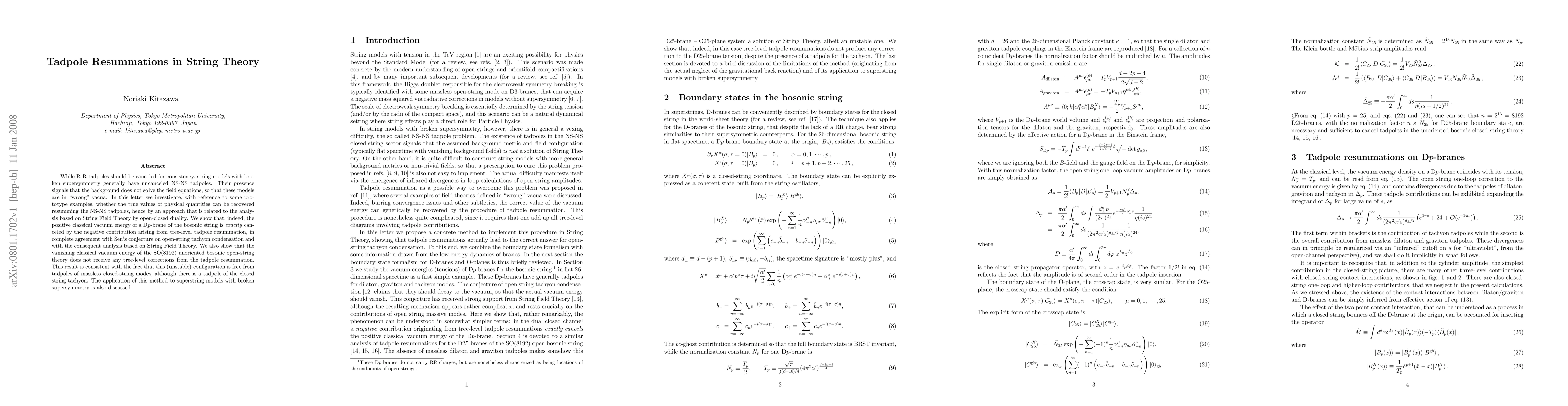 This paper explores the resummation of NS-NS tadpoles in string theory to recover the true values of physical quantities in models with broken supersymmetry. It demonstrates that tadpole resummation cancels the positive classical vacuum energy of Dp-branes, aligning with Sen's conjecture on open-string tachyon condensation and confirming the absence of tree-level corrections in certain unstable configurations.