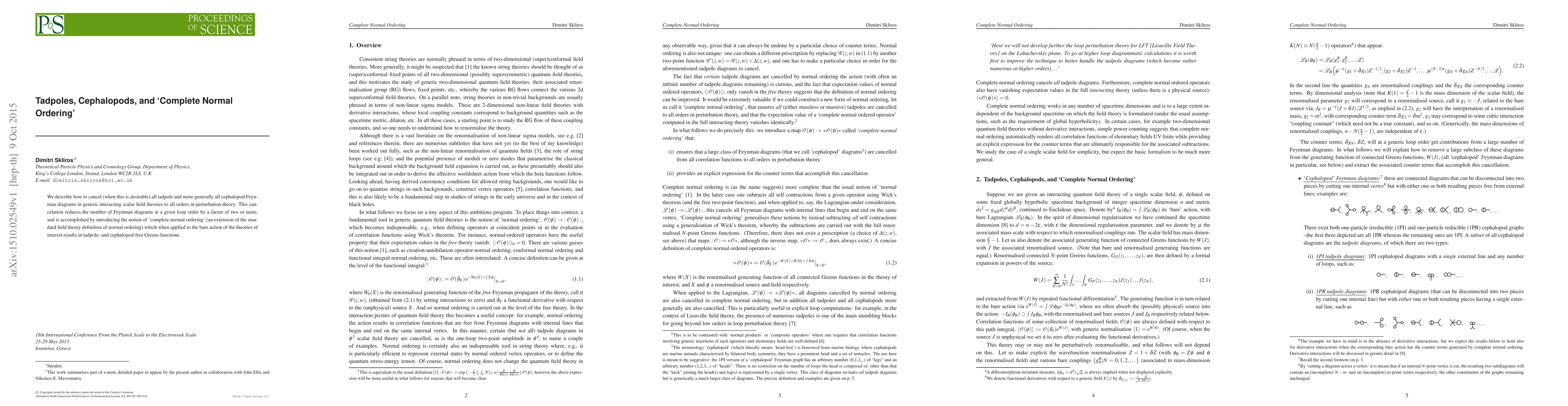 The paper introduces 'complete normal ordering', an extension of standard field theory normal ordering, to cancel tadpole and cephalopod diagrams in scalar field theories to all orders in perturbation theory.