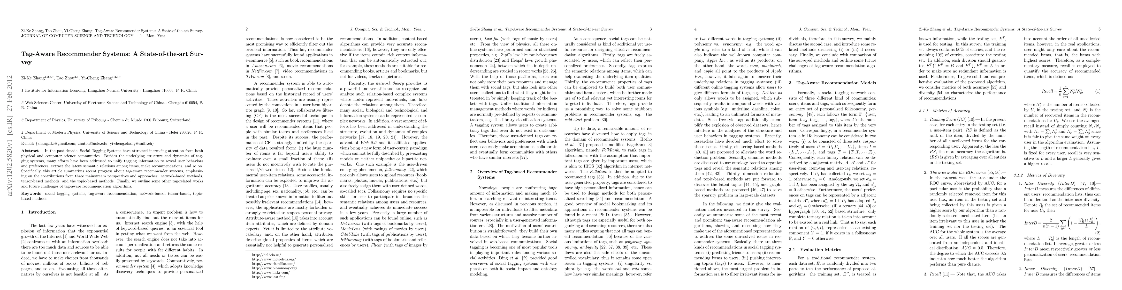 This paper surveys recent advancements in tag-aware recommender systems, focusing on network-based, tensor-based, and topic-based methods. It also discusses other related works and future research challenges in this domain.