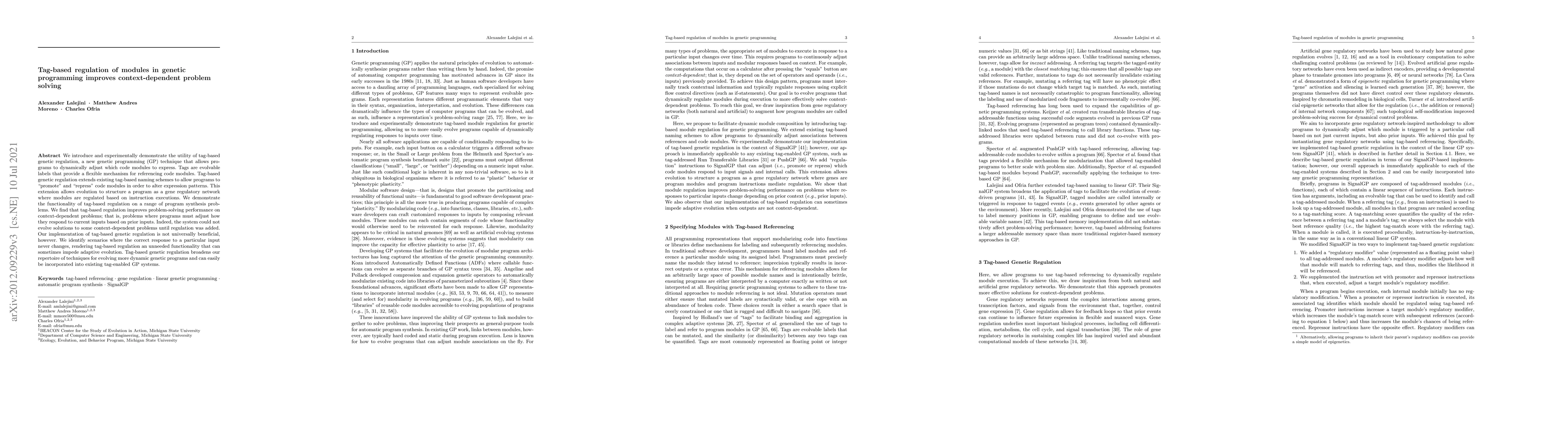 Tag-based genetic regulation improves problem-solving performance on context-dependent problems by allowing programs to dynamically adjust code module expression based on instruction executions.