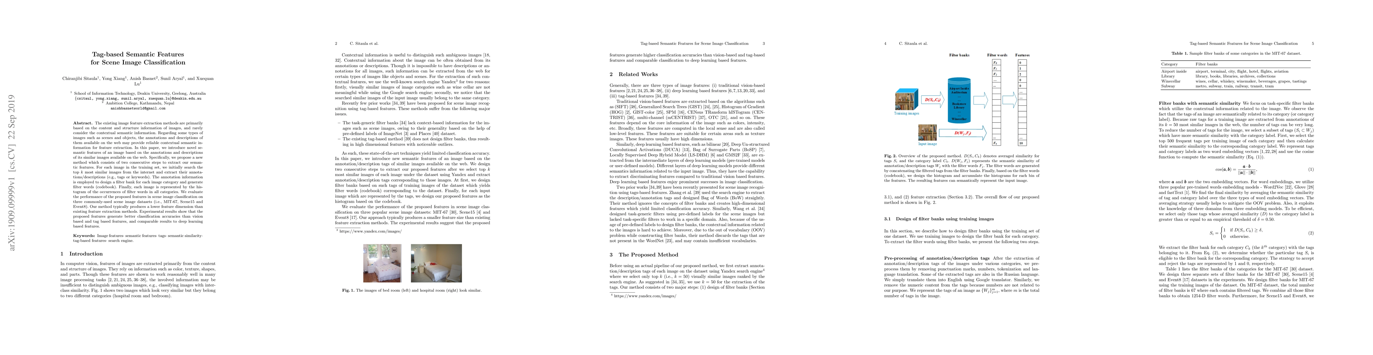 This paper introduces a novel method for scene image classification using semantic features derived from web annotations and descriptions of similar images. The method extracts filter words from top similar images to generate a filter bank, representing each image by a histogram of these filter words, achieving better classification accuracy compared to traditional vision-based and tag-based features.